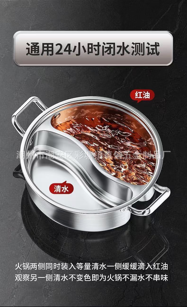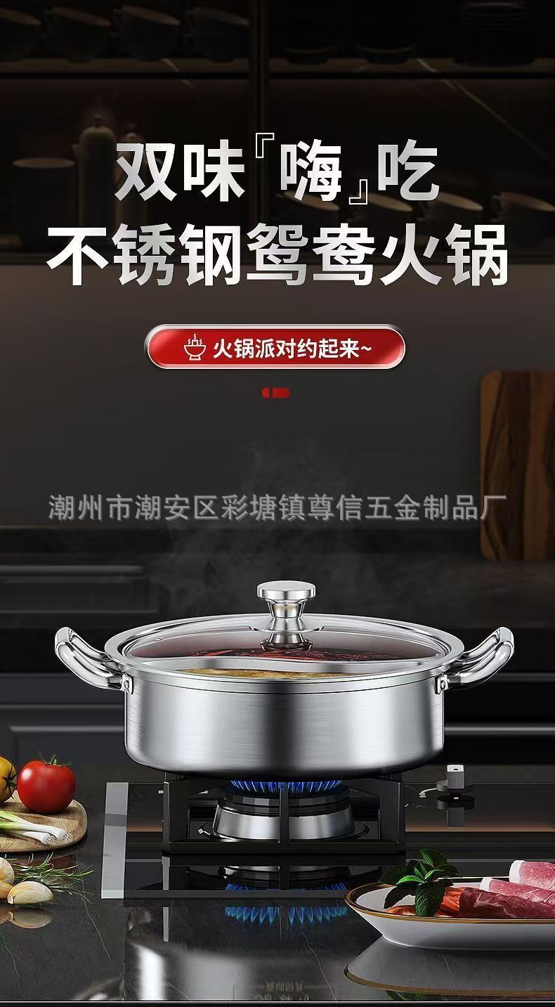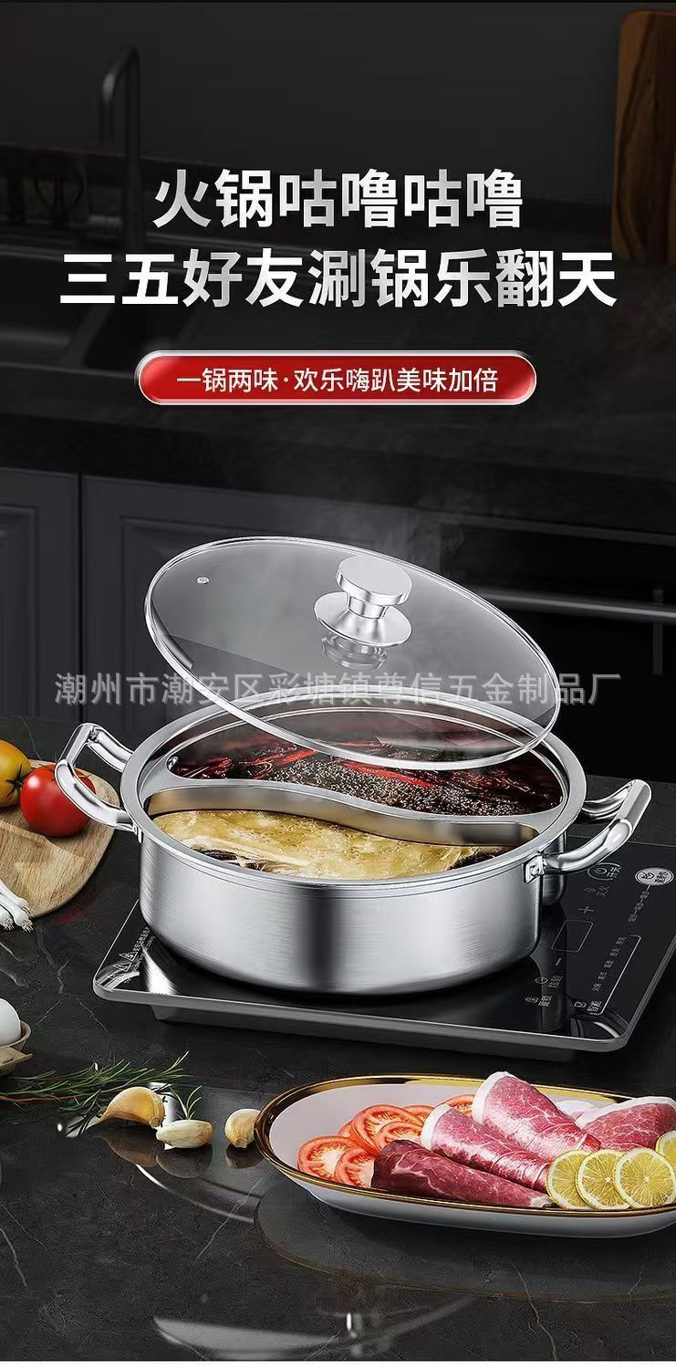 不锈钢特厚鸳鸯锅一体成型耐高温家用带盖大容量商用火锅涮锅厂家