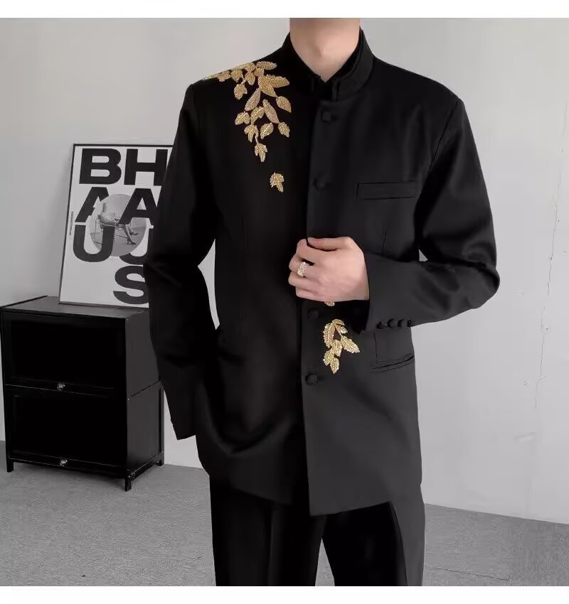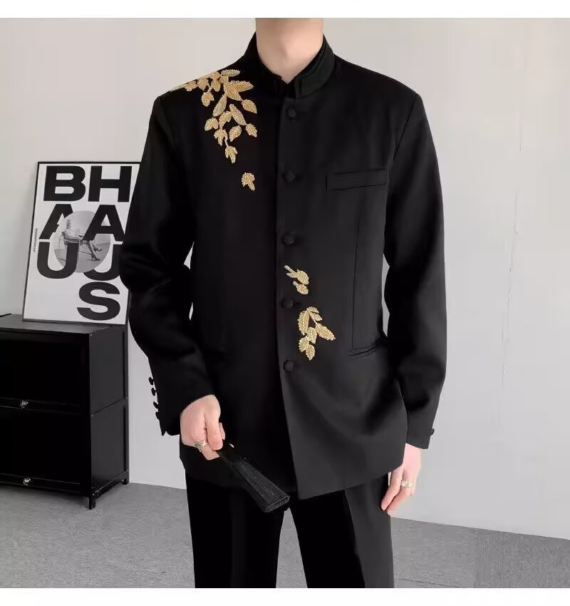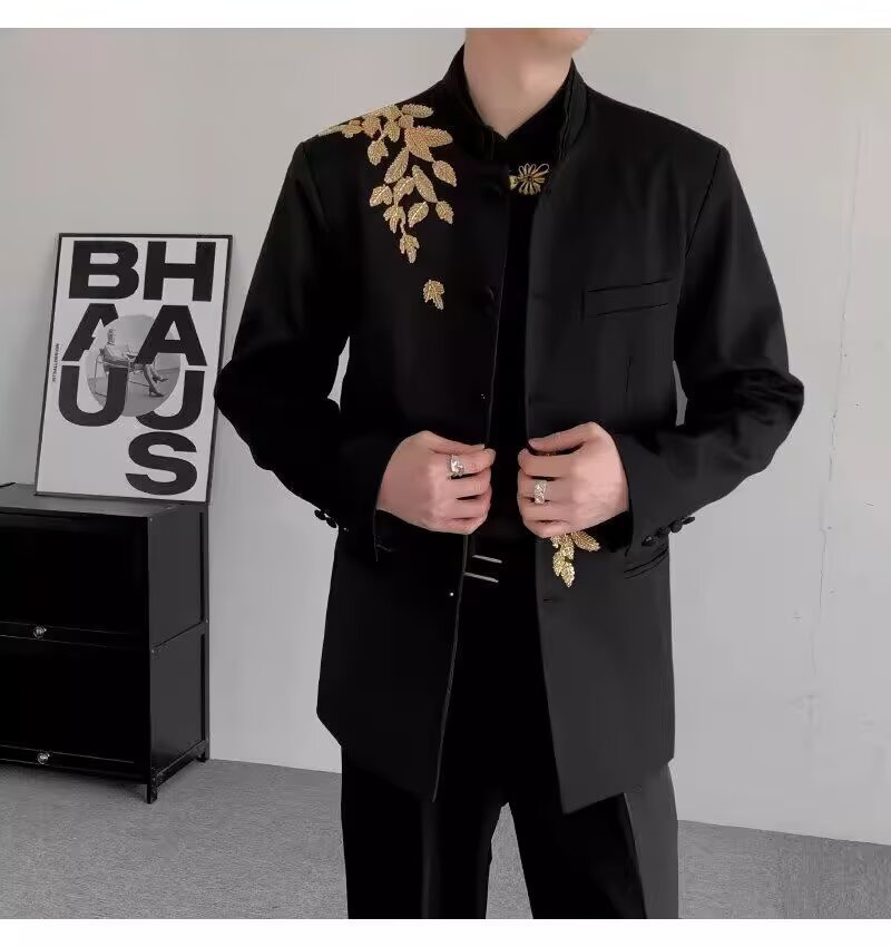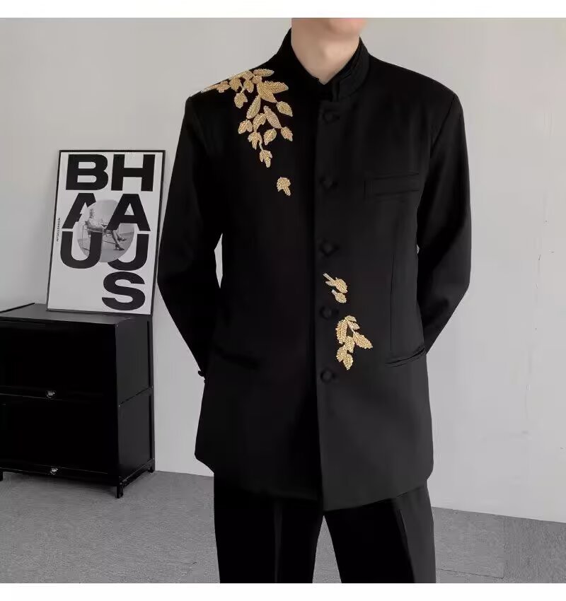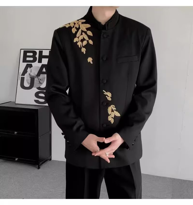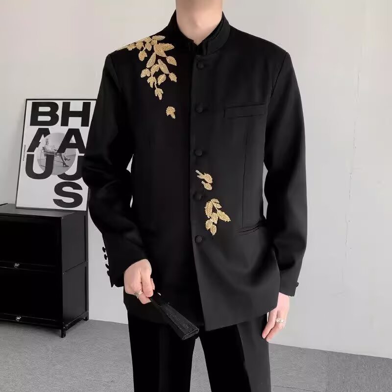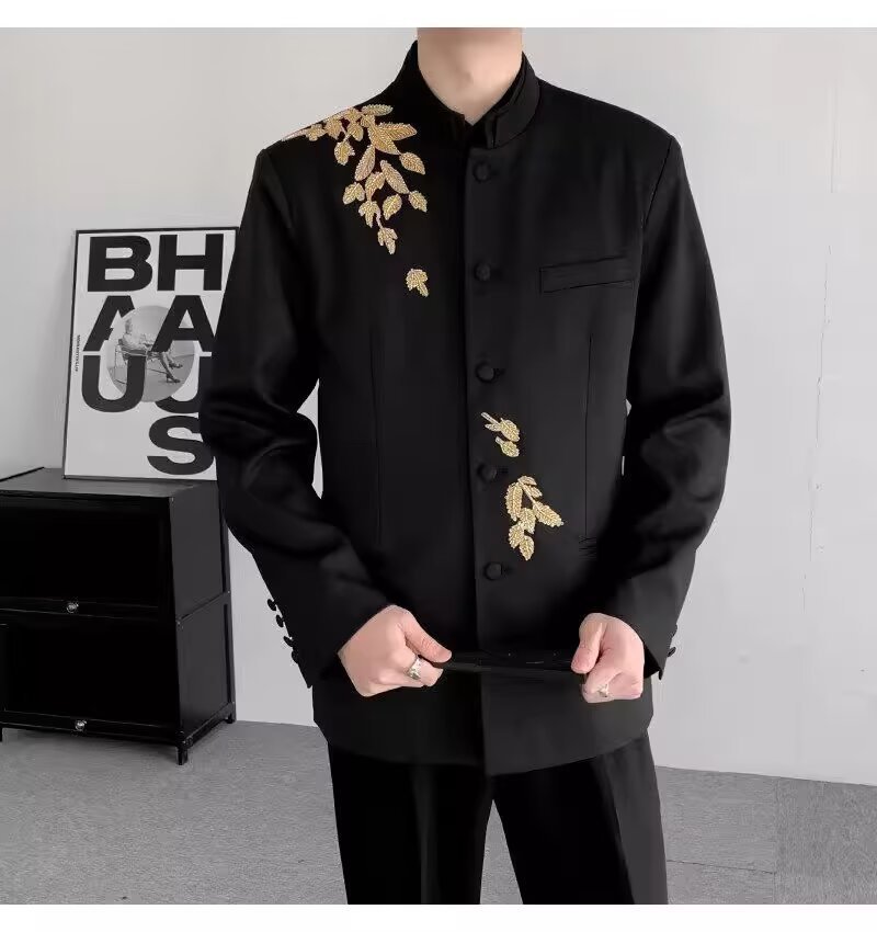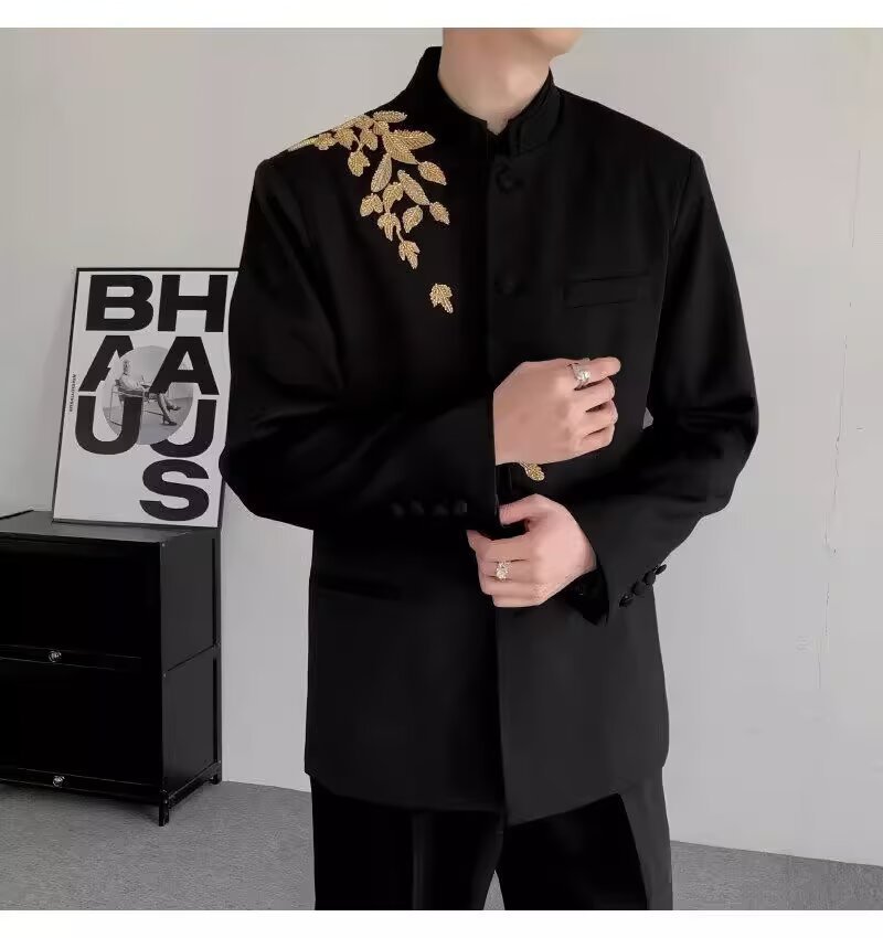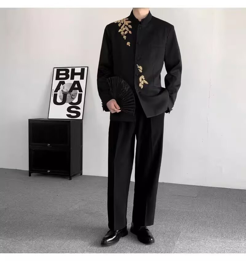 新中国式中山装男痞帅スーツ黒立襟スーツコート高級感結婚式婚約着スーツ