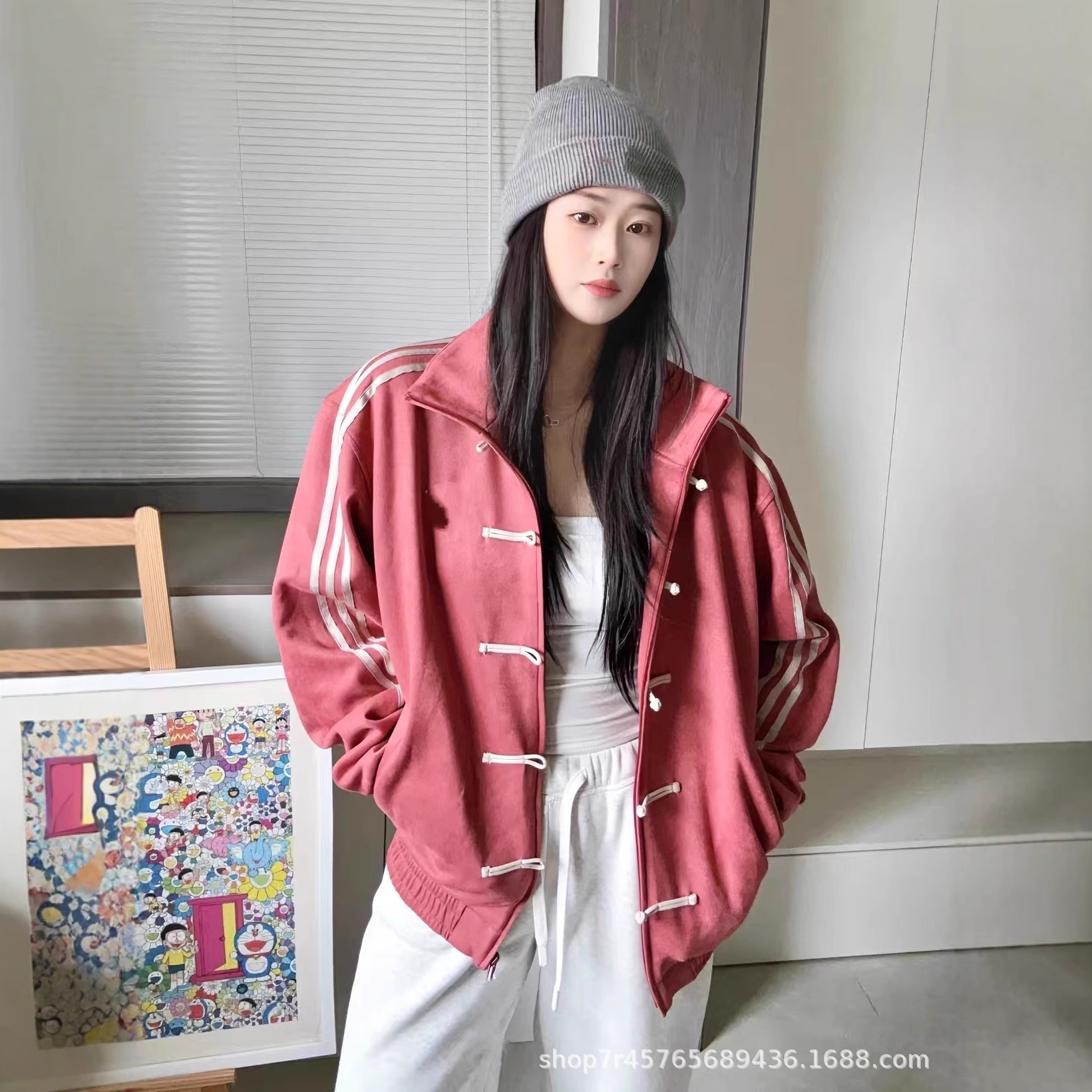 新中式唐装刺绣logo鹿皮运动外套夹克盘扣夹克立领9926三条杠