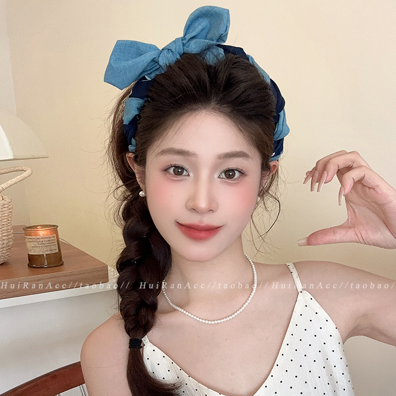牛仔蓝波点蝴蝶结发箍2025新款高端日常外戴头箍带齿防滑发捆头饰