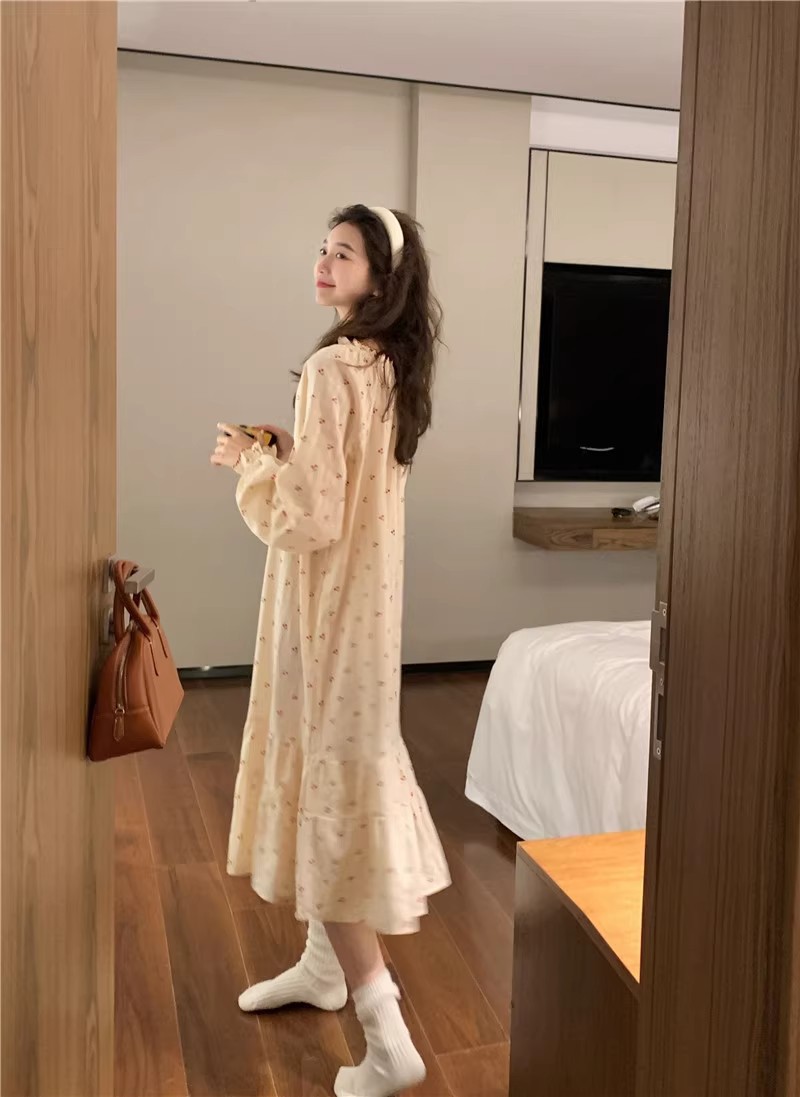 優しいレースの縁の襟がゆったりしていて怠惰な風が甘い長袖の花の家の服の通気性の綿糸の寝スカートの秋の女性