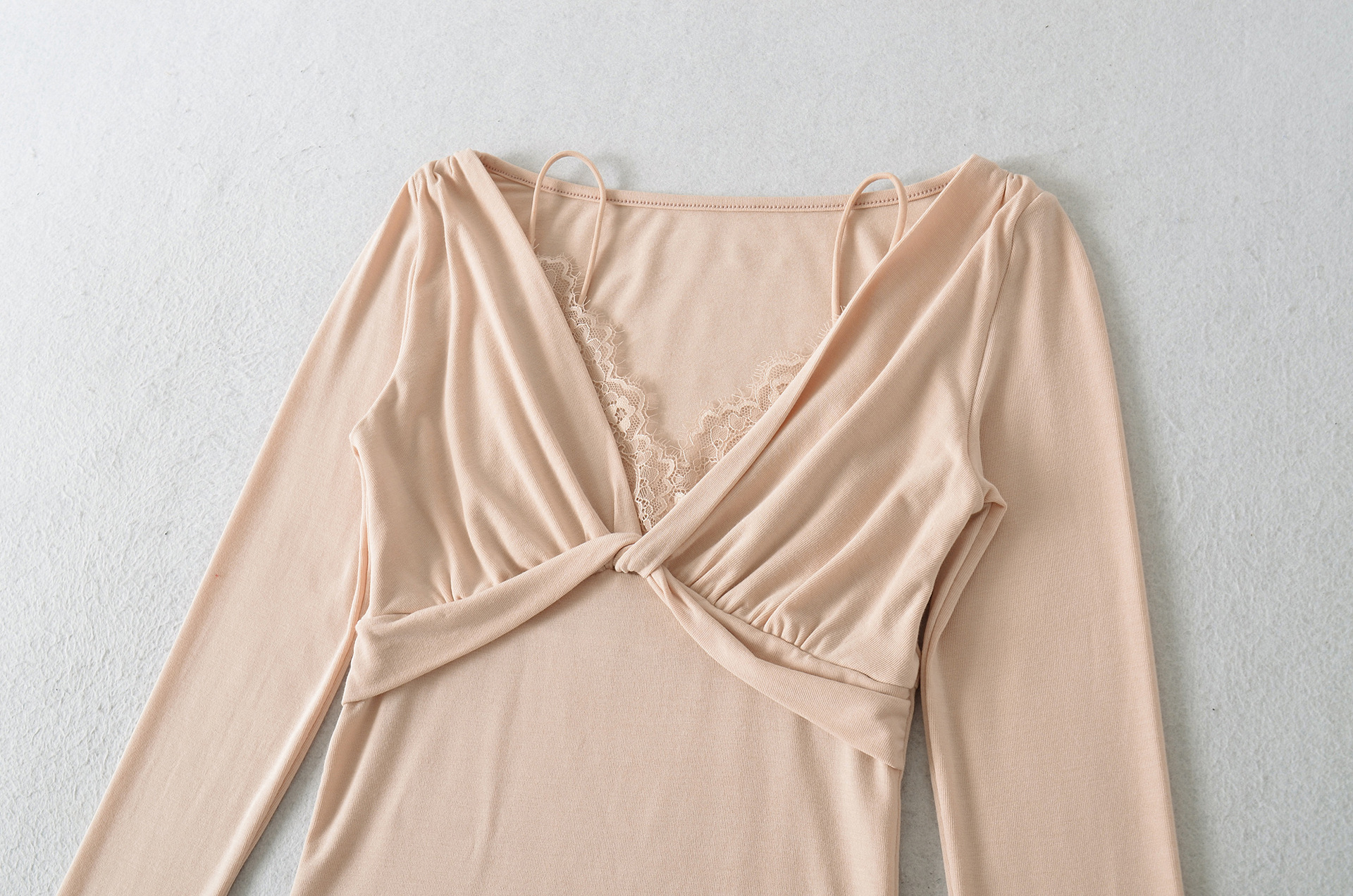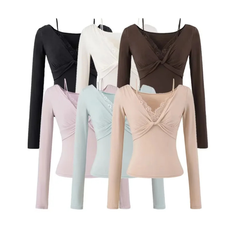 跨境女装批发欧美辣妹风性格蕾丝拼接V领长袖拷边修身T恤打底衫