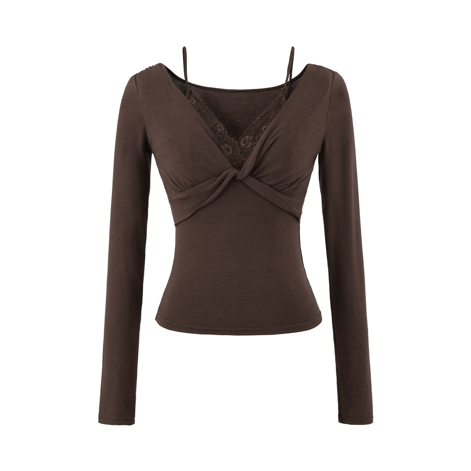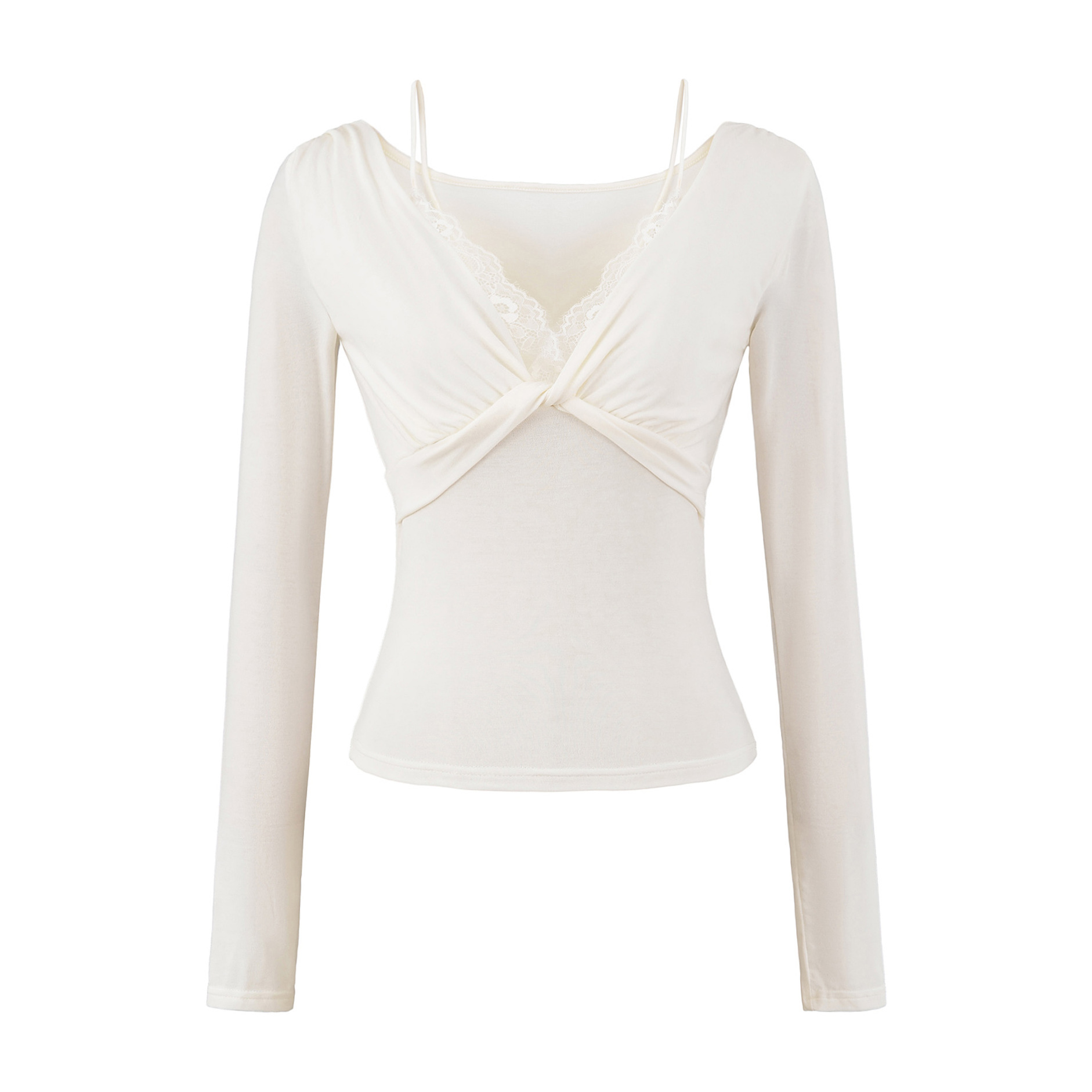 蕾丝拼接假两件长袖T恤女2025秋季新款辣妹设计感V领扭结修身上衣