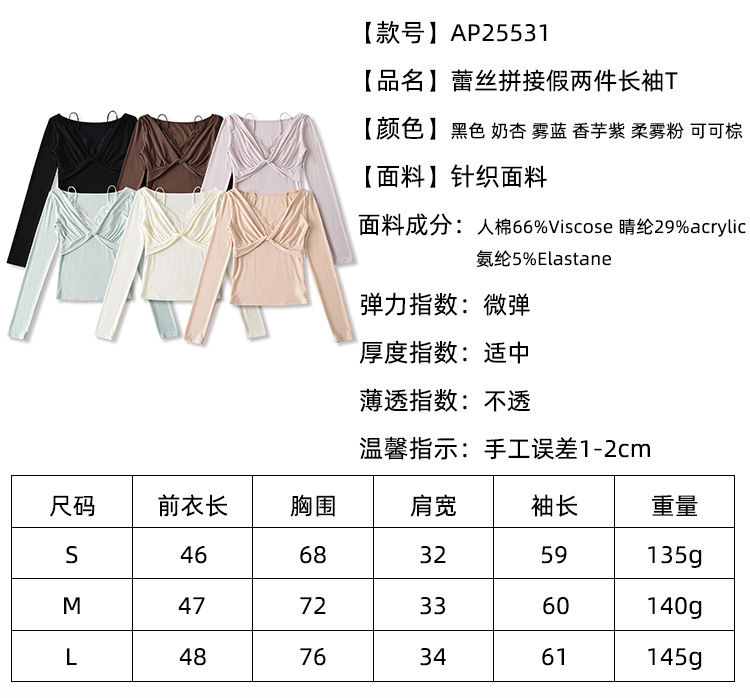 跨境女装批发 欧美风2025秋季新款针织长袖蕾丝拼接假两件长袖T恤