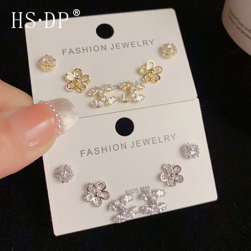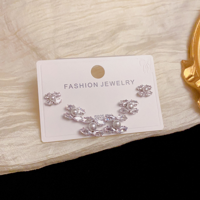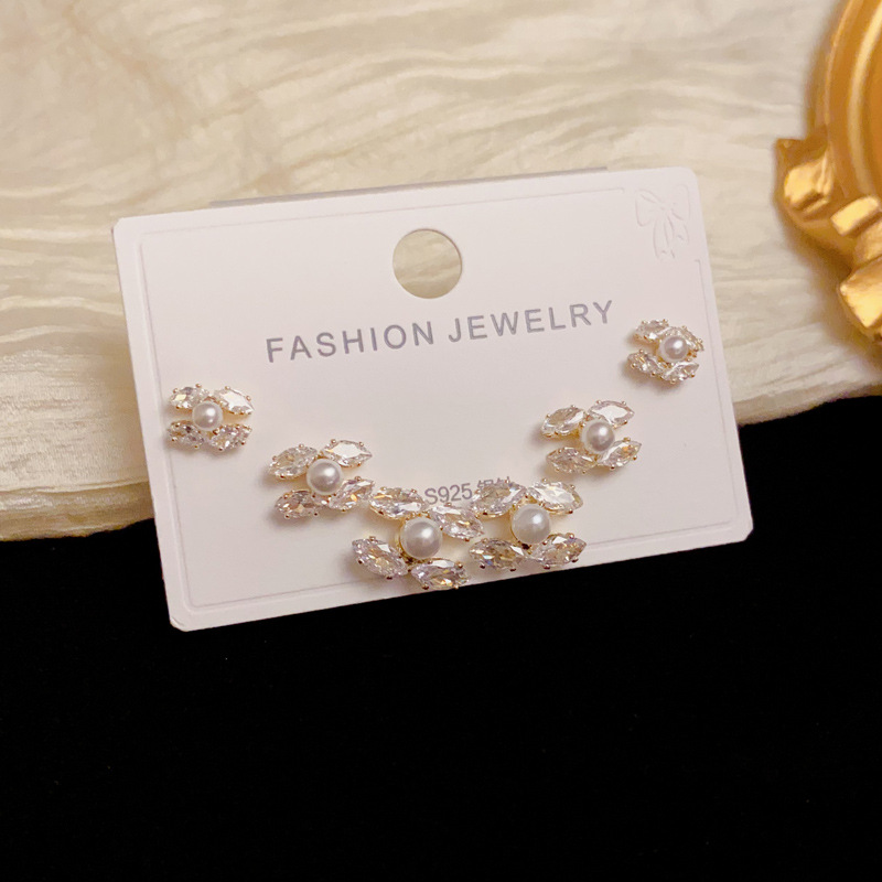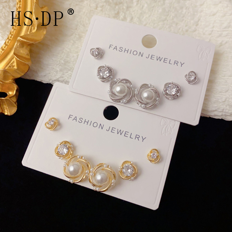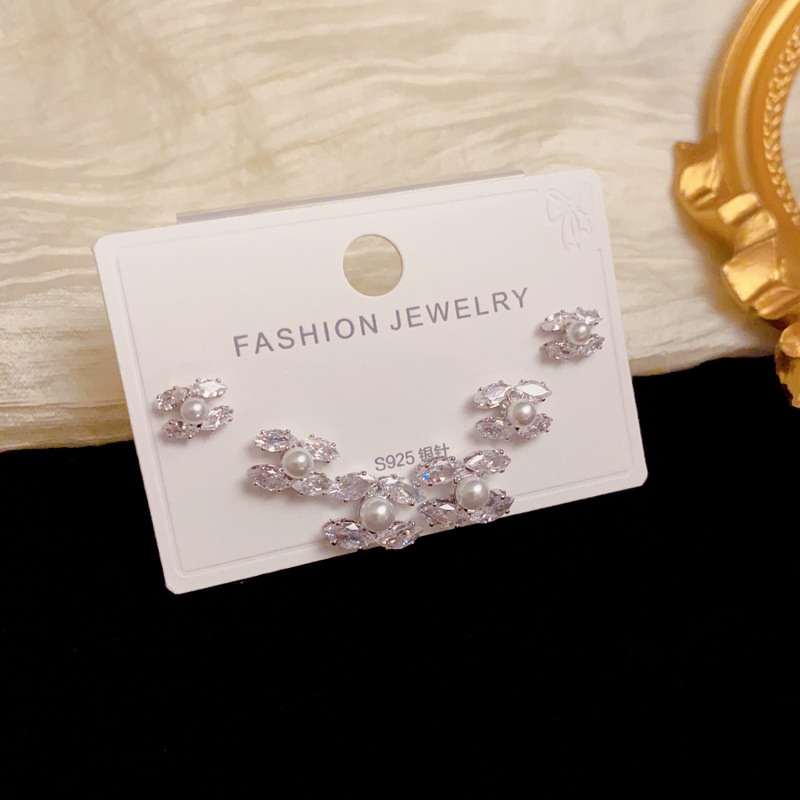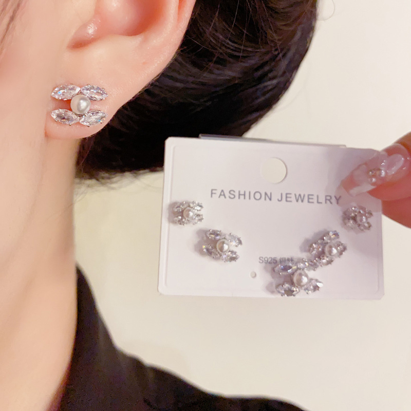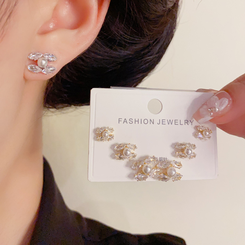 小香风微镶锆石交叉珍珠三件套耳钉精致时尚百搭通勤超闪耳环批发