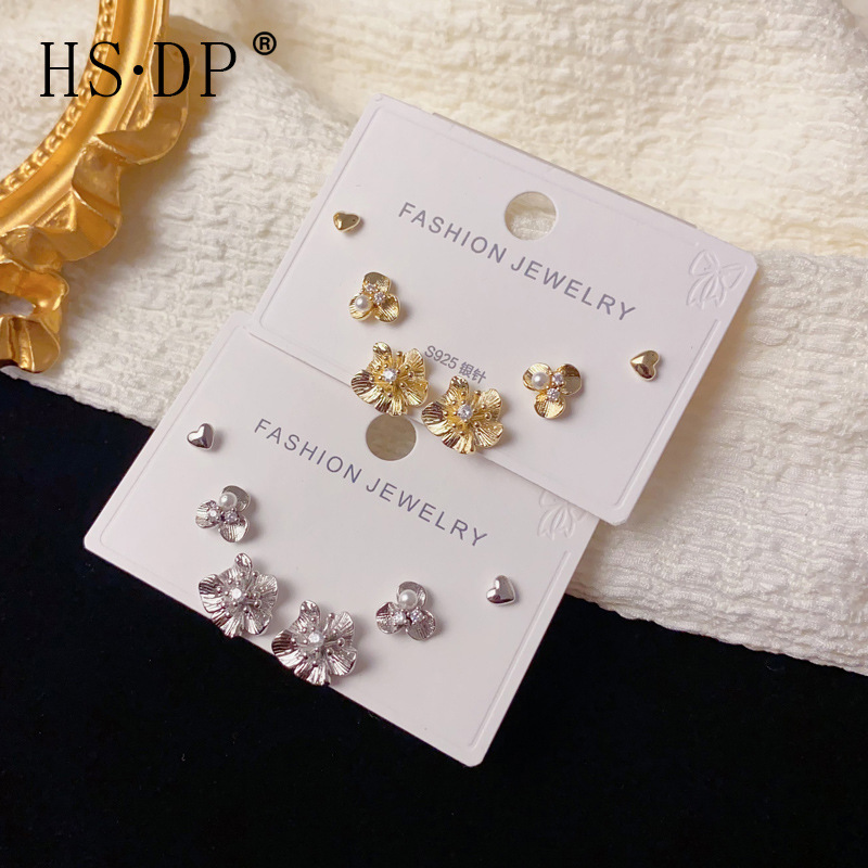法式时尚简约金属花瓣爱心三件套耳钉气质轻奢日常百搭通勤耳环女
