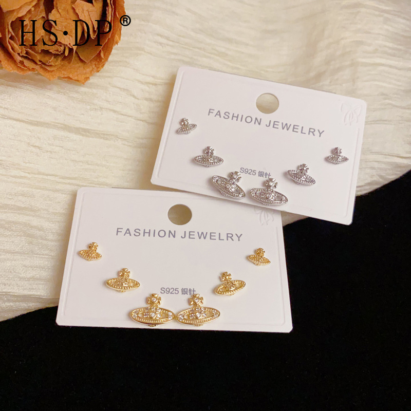 ニッチなデザイン、ダイヤモンドがちりばめられた土星の3ピースイヤリングセット、絶妙でファッショナブル、コンパクトで多用途、超キラキライヤリングセット