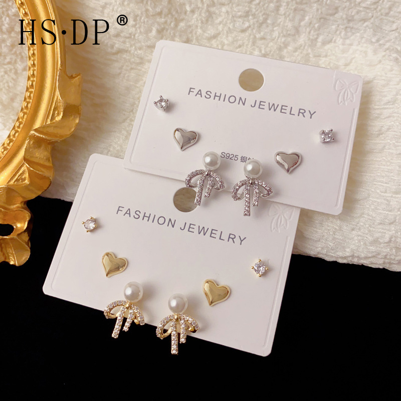 韩版时尚简约金属爱心蝴蝶结珍珠三件套耳钉精致轻奢百搭设计耳环