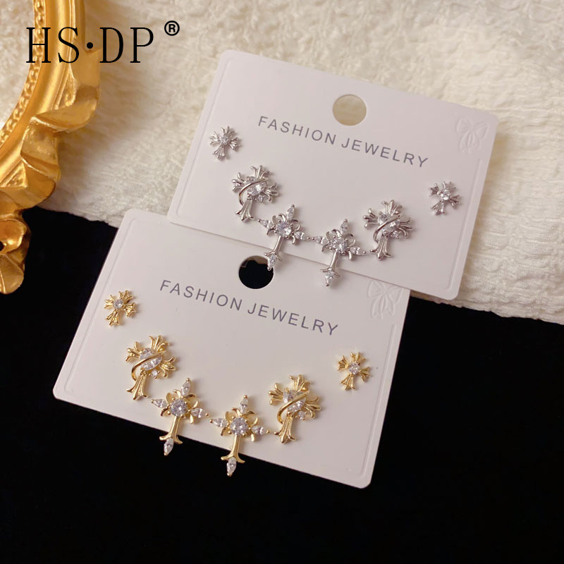 日韩时尚满钻十字架三件套耳钉女精致轻奢百搭设计感超闪耳环批发