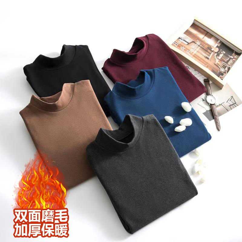 男性の秋冬の徳絨毛の長袖は保温して中に両面の絨毛の半高襟の中で襟の修身の上着の純色の底のシャツを掛けます。