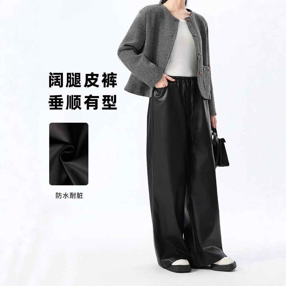 酷飒黑色垂顺阔腿皮裤秋冬加绒款宽松版型藏肉显瘦防水耐脏休闲裤