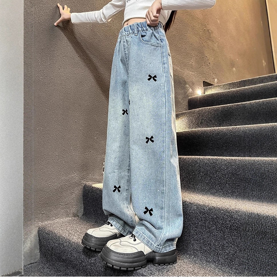 女の子用デニムパンツ 夏2025新作 子供用ストレートワイドパンツ 女の子用秋服パンツ 中学生向け