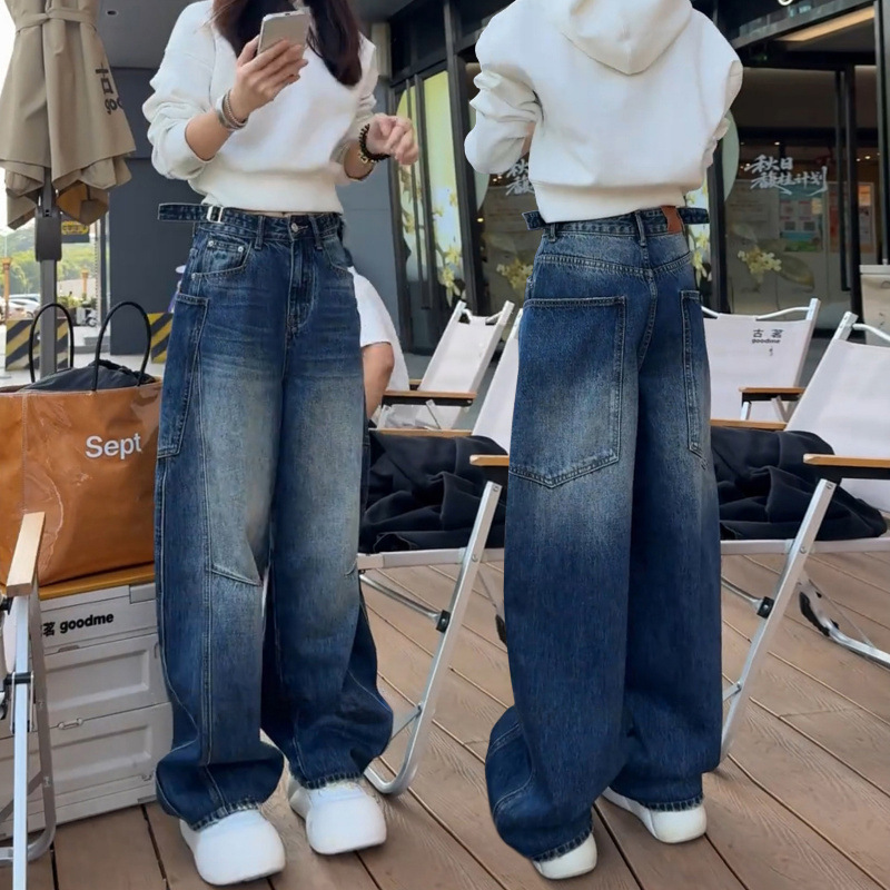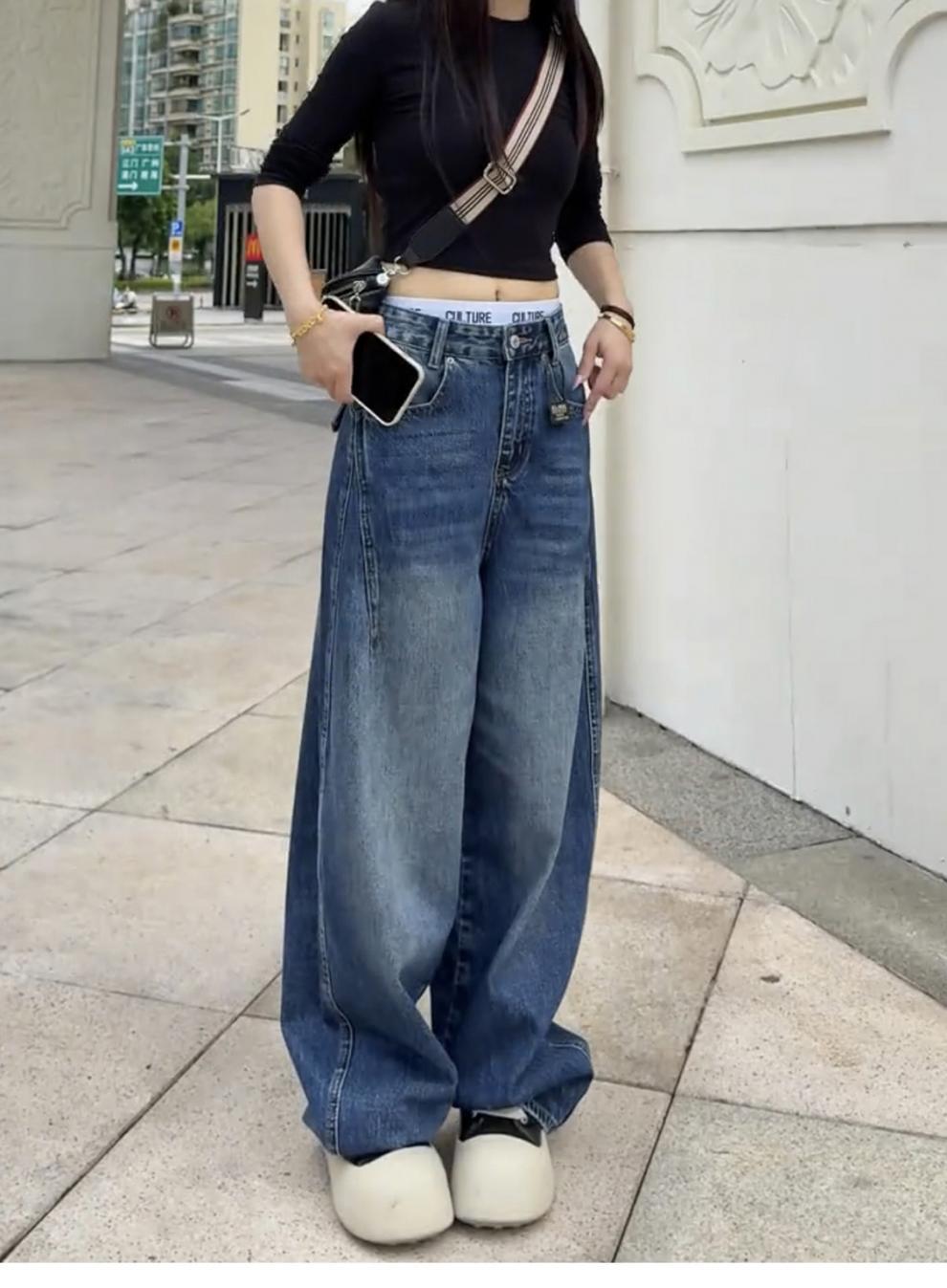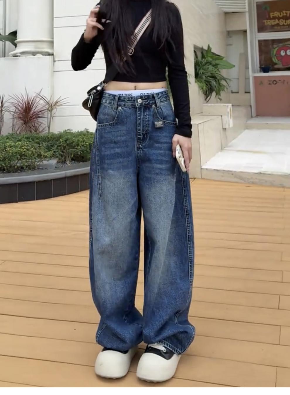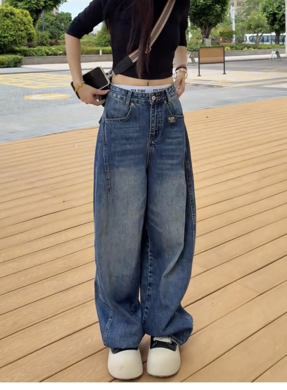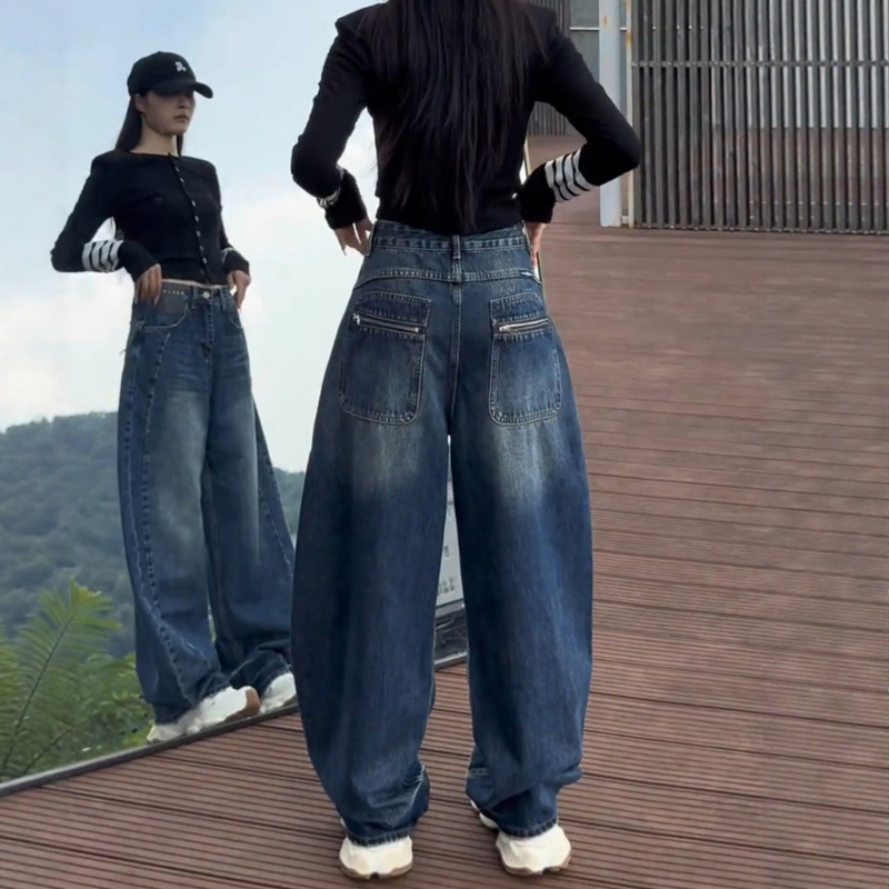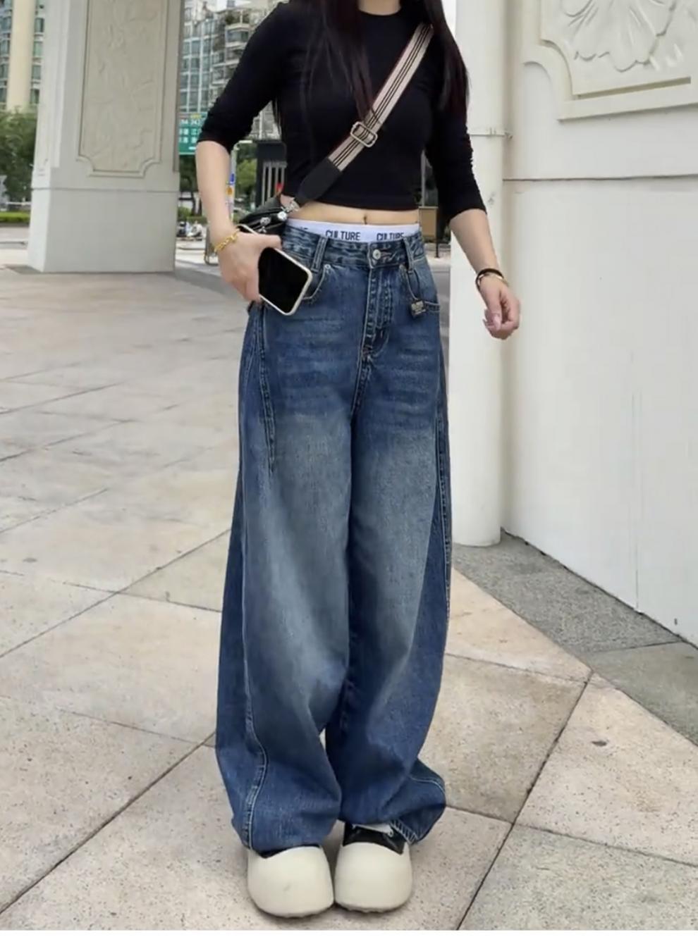 アメリカのレトロな高街のゆるい広脚ジーンズ女性2025春秋の新しいデザイン感の高い腰の垂直感のある曲がり角のズボン