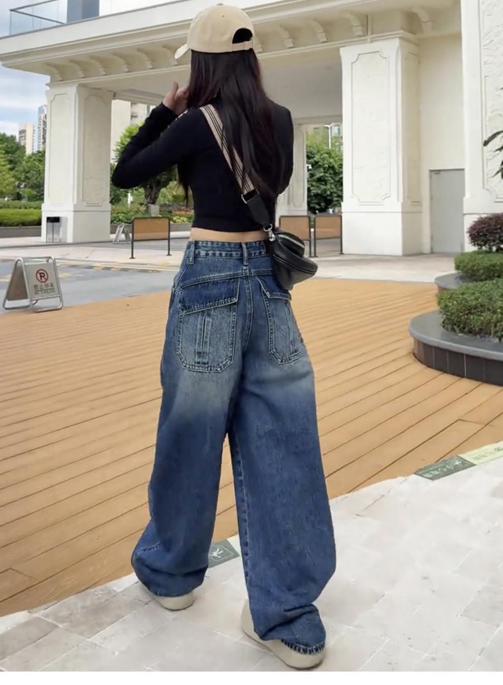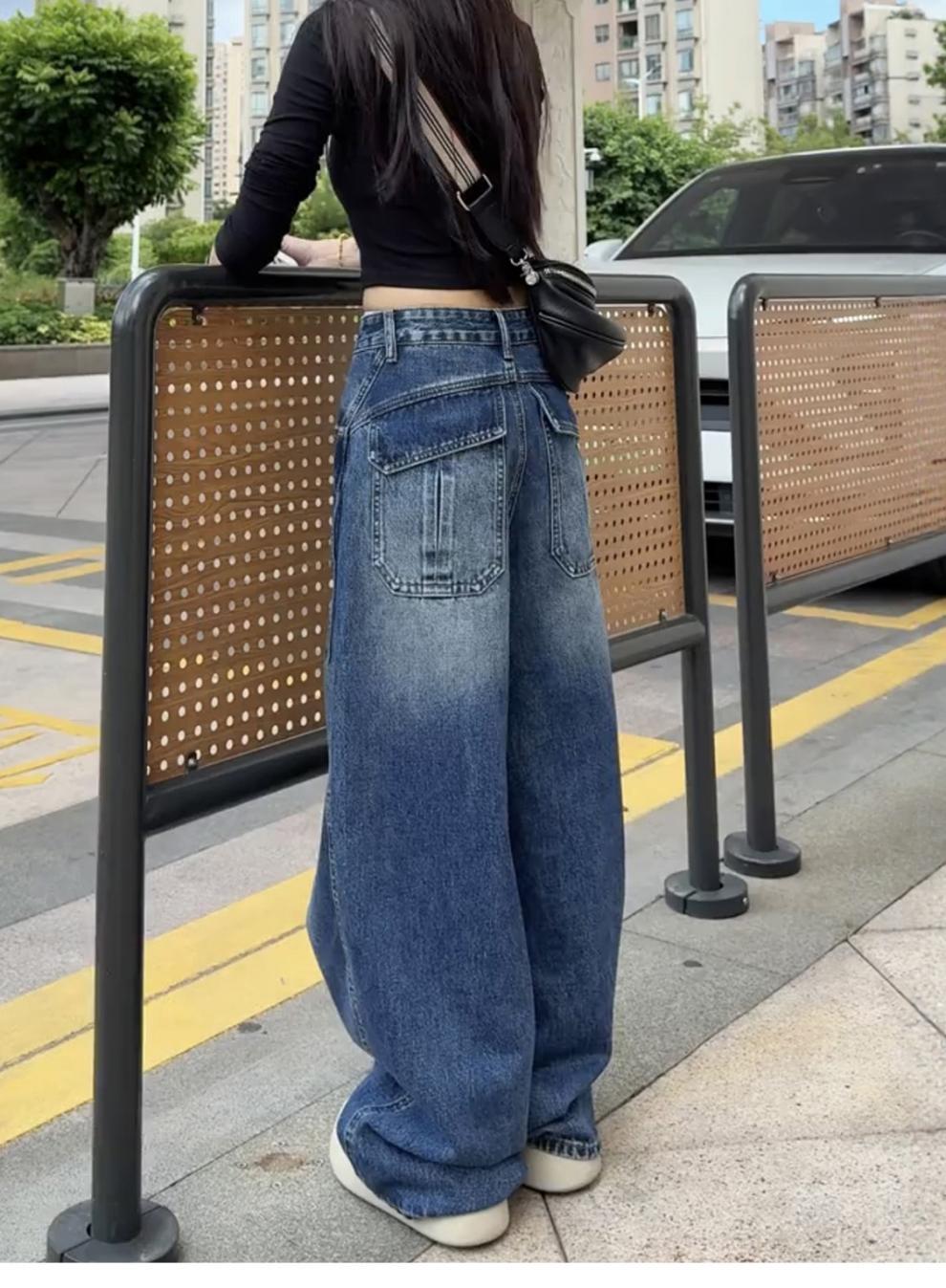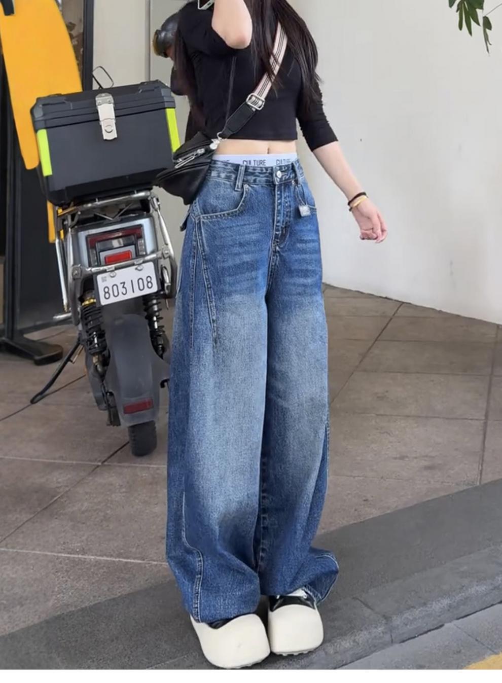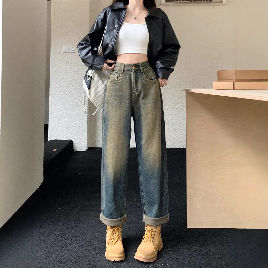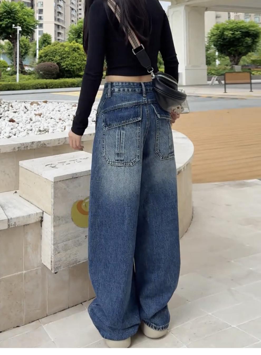 アメリカのレトロな高街のゆるい広脚ジーンズ女性2025春秋の新しいデザイン感の高い腰の垂直感のある曲がり角のズボン