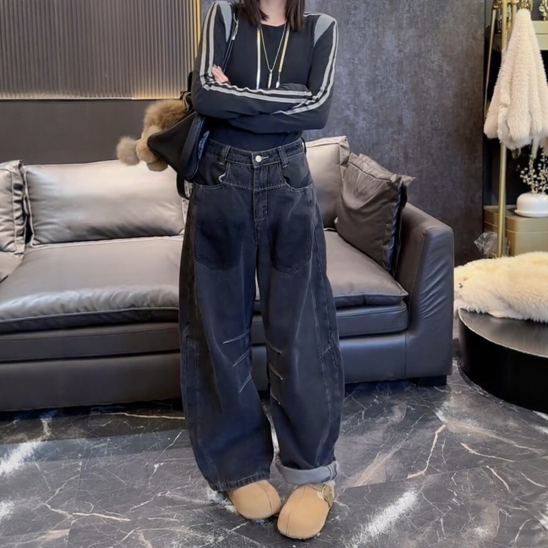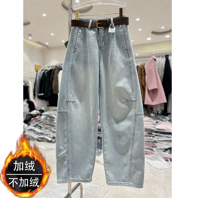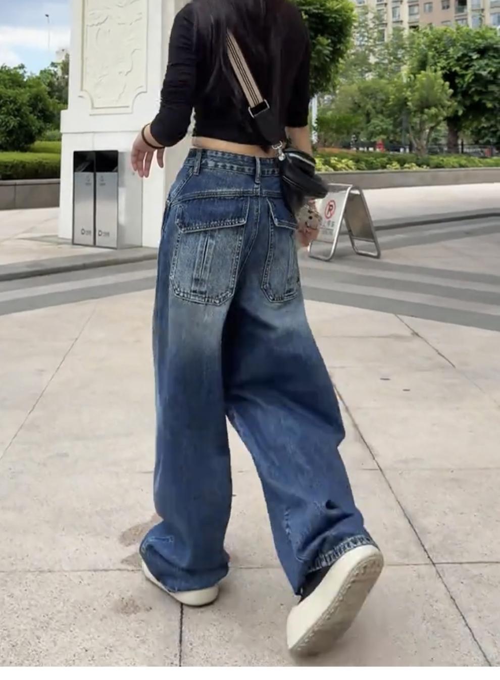复古蓝加绒加厚牛仔裤女冬季新款辣妹潮流慵懒宽松直筒拖地阔腿裤