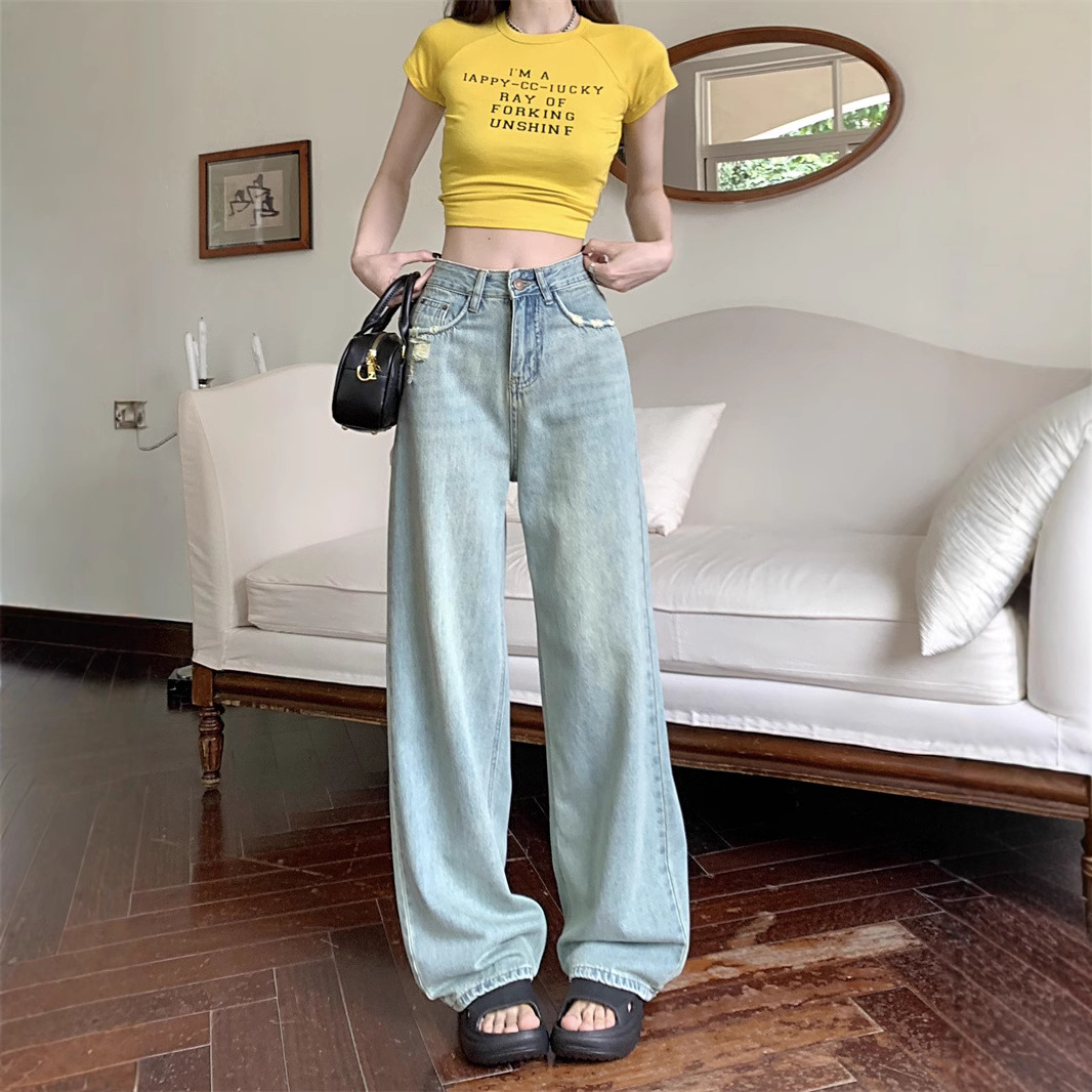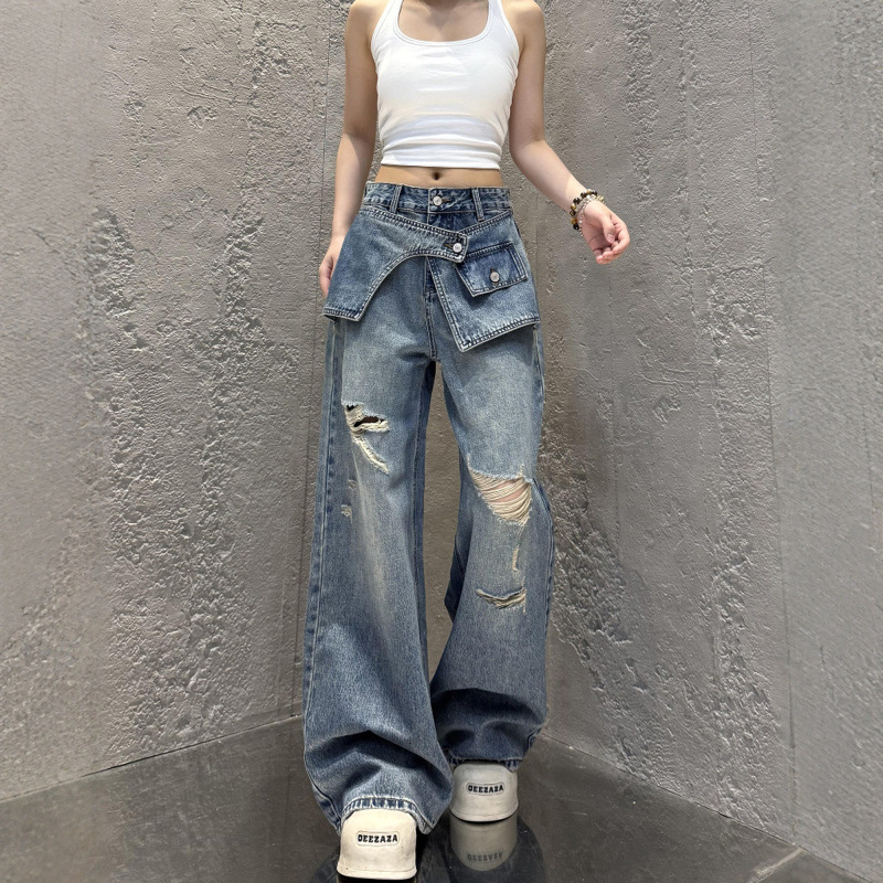 大码美式阔腿牛仔裤女夏季薄款2025新款胖mm显瘦复古破洞直筒裤子