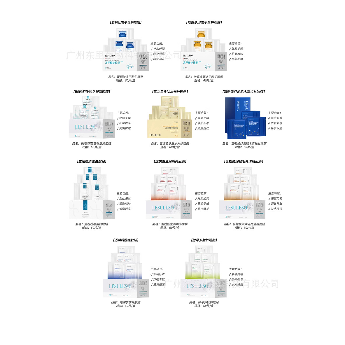 产品规格 海藻面膜【10盒】,富勒烯面膜【10盒】,维生素B5舒缓保湿面膜【10盒】,积雪草面膜【10盒】,虾青素面膜【10盒】