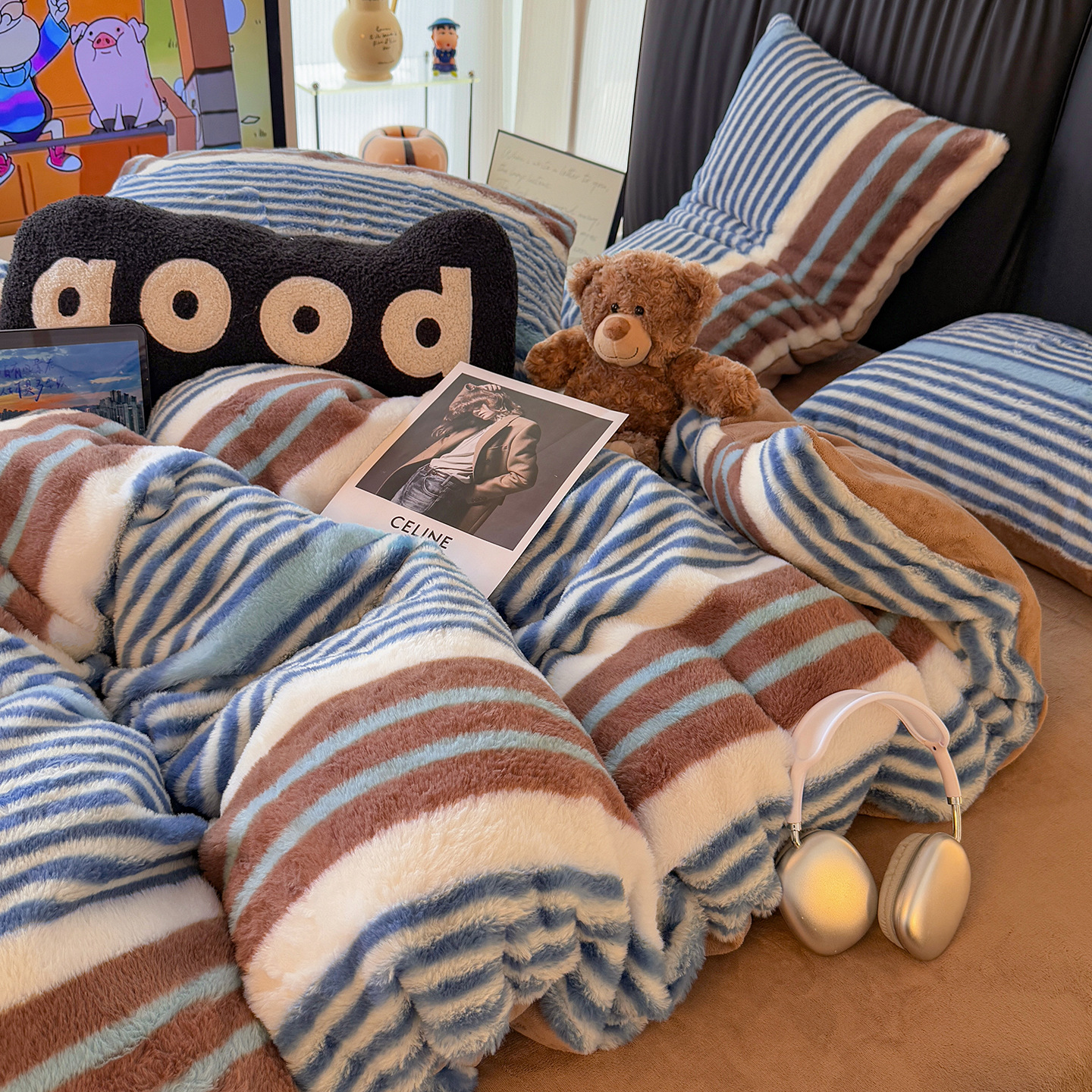 ins简约条纹兔毛绒床上四件套秋冬季加厚牛奶绒2025新款被套床单