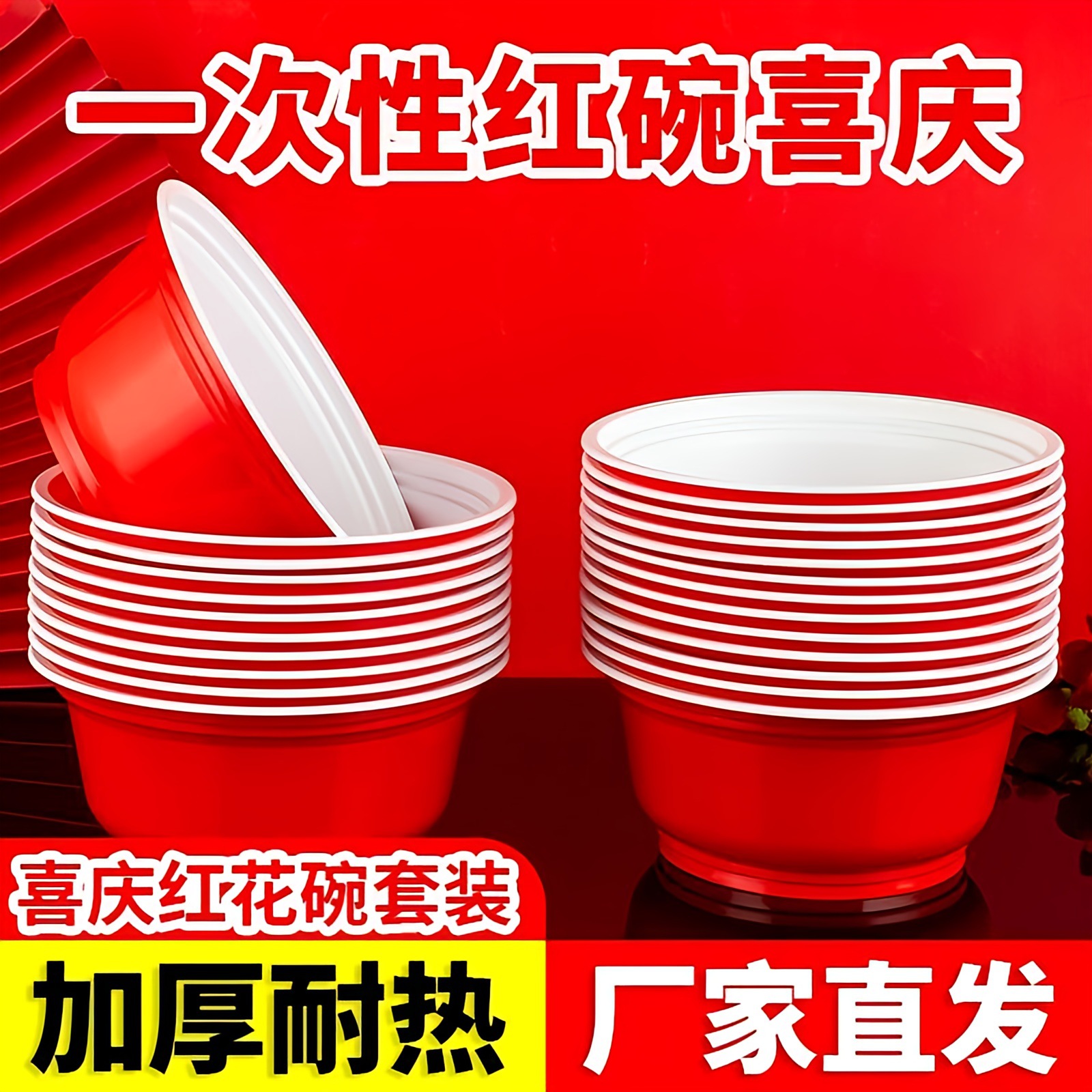 使い捨ての赤い碗のプラスチックの碗は結婚します。