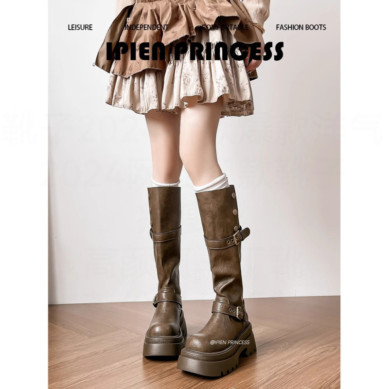 美ラードの茶色のファッションの長靴の女性の2025春夏の新型の太い足の高くなる騎士の靴の小さい背の高いブーツ