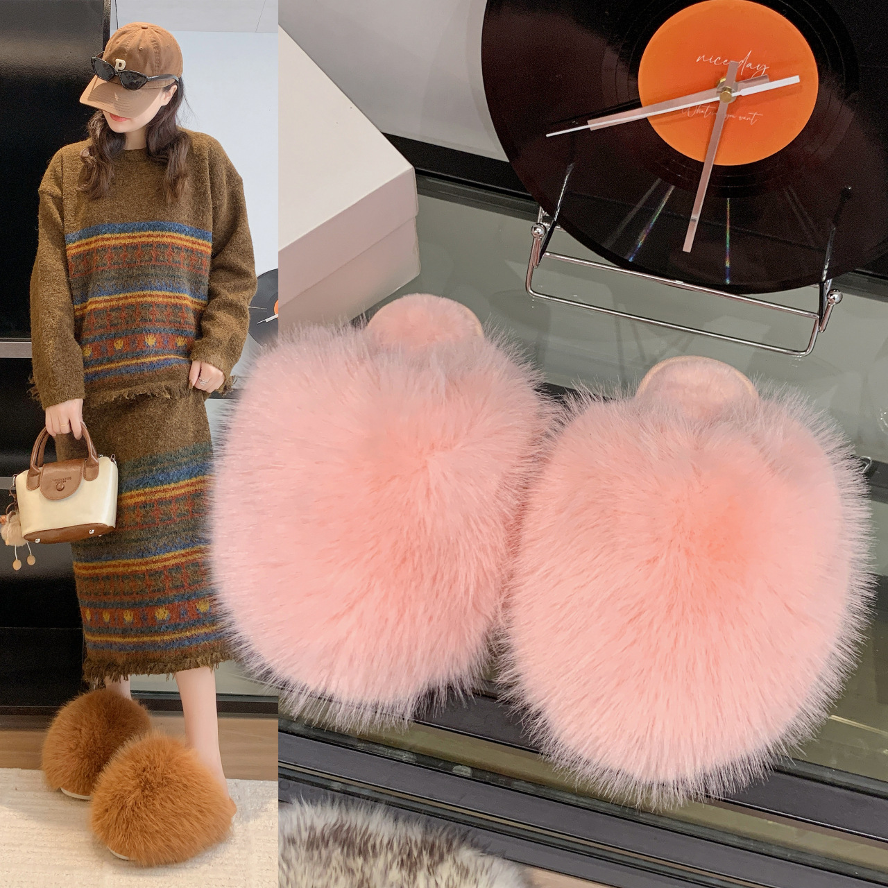 跨境亚马逊蓬松毛毛拖鞋女秋冬季时尚多色外贸43大码新款包头棉拖