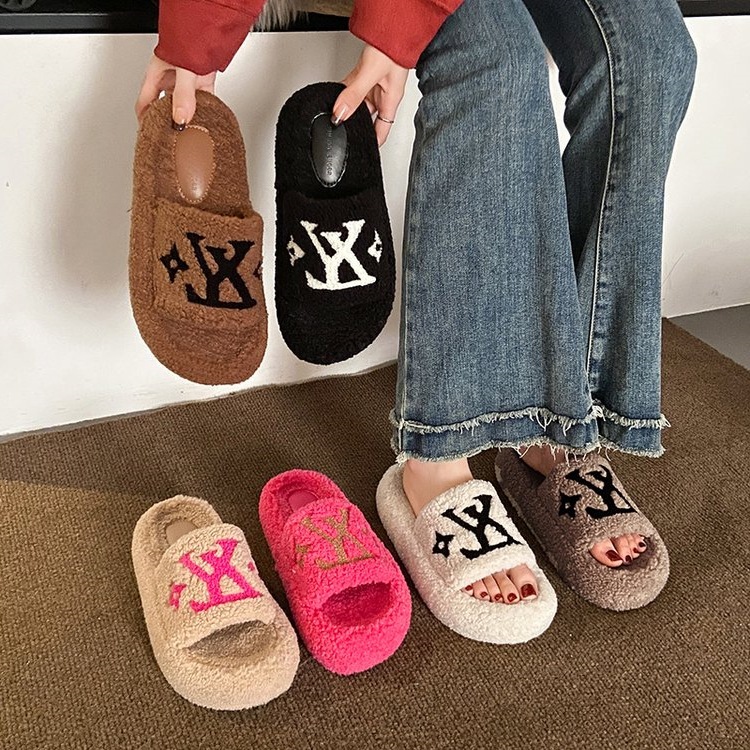 ネットセレブ愛用の毛皮スリッパ レディース 2025年秋冬新作 タオル刺繍文字入り 保温性のあるフラットソール モコモコスリッパ 外履き