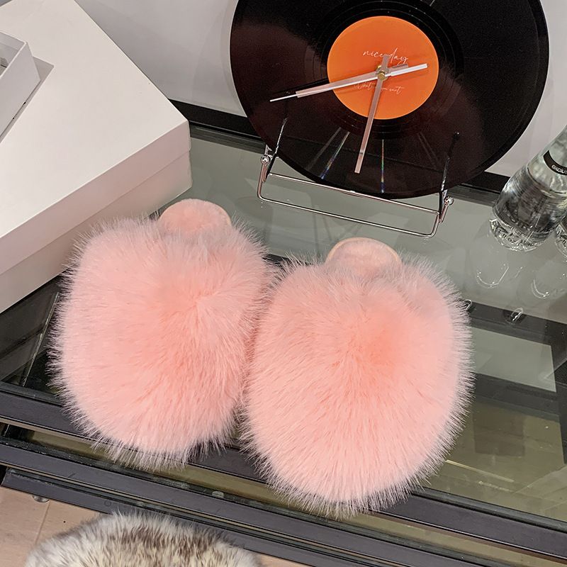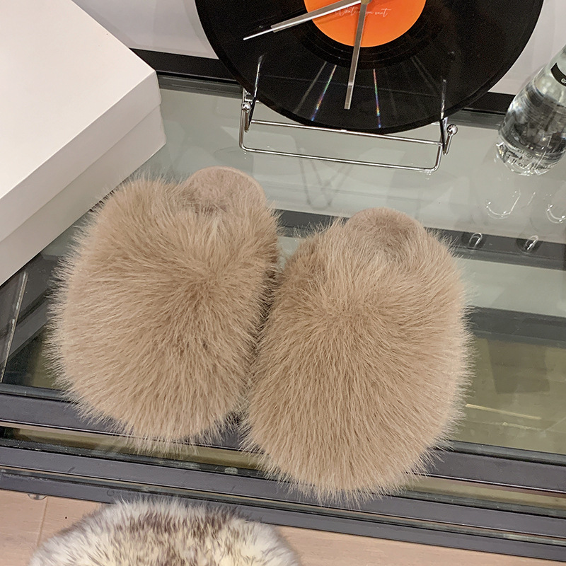 跨境外贸纯色蓬松大毛毛拖鞋软底平底冬季包头家居保暖棉拖鞋批发