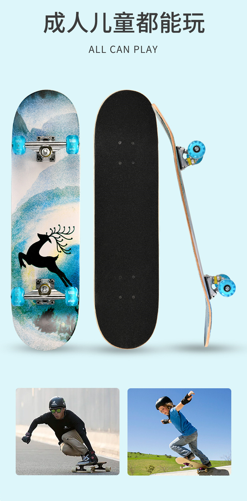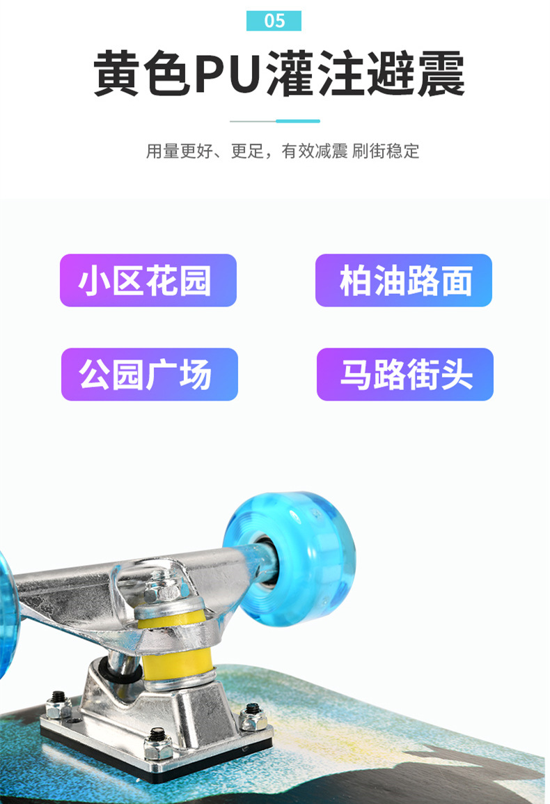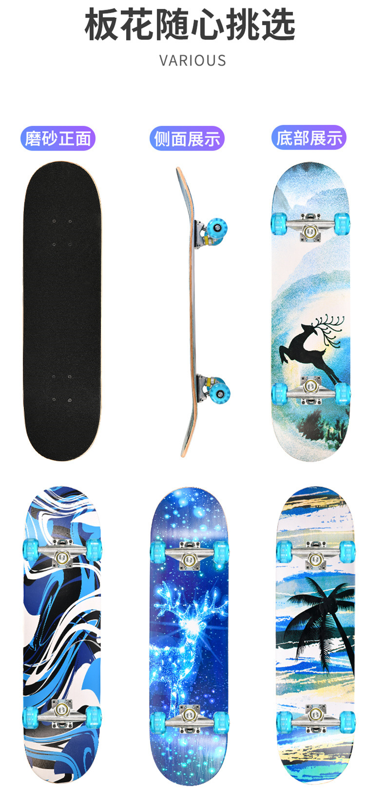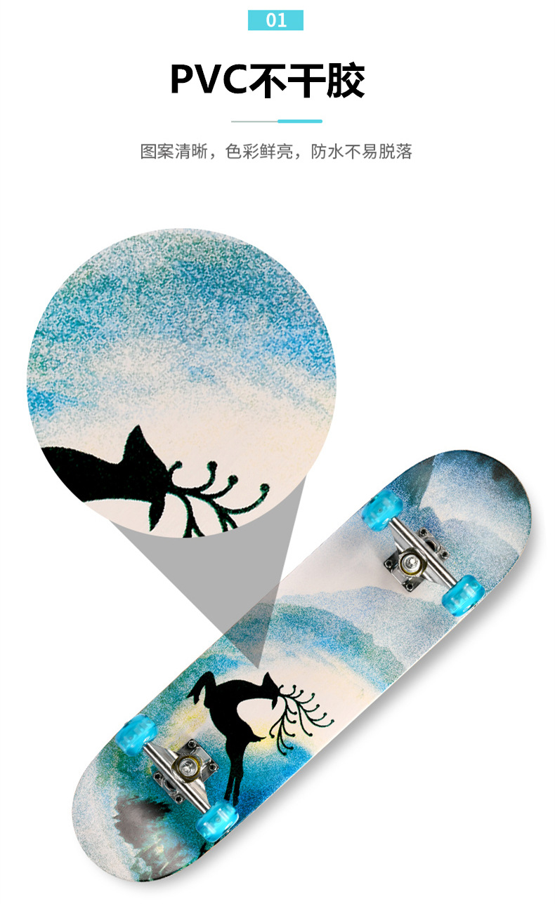 滑板板面:背面图案采用不干胶工艺,正面为PVC防滑黑砂(具有很好的防滑效果)