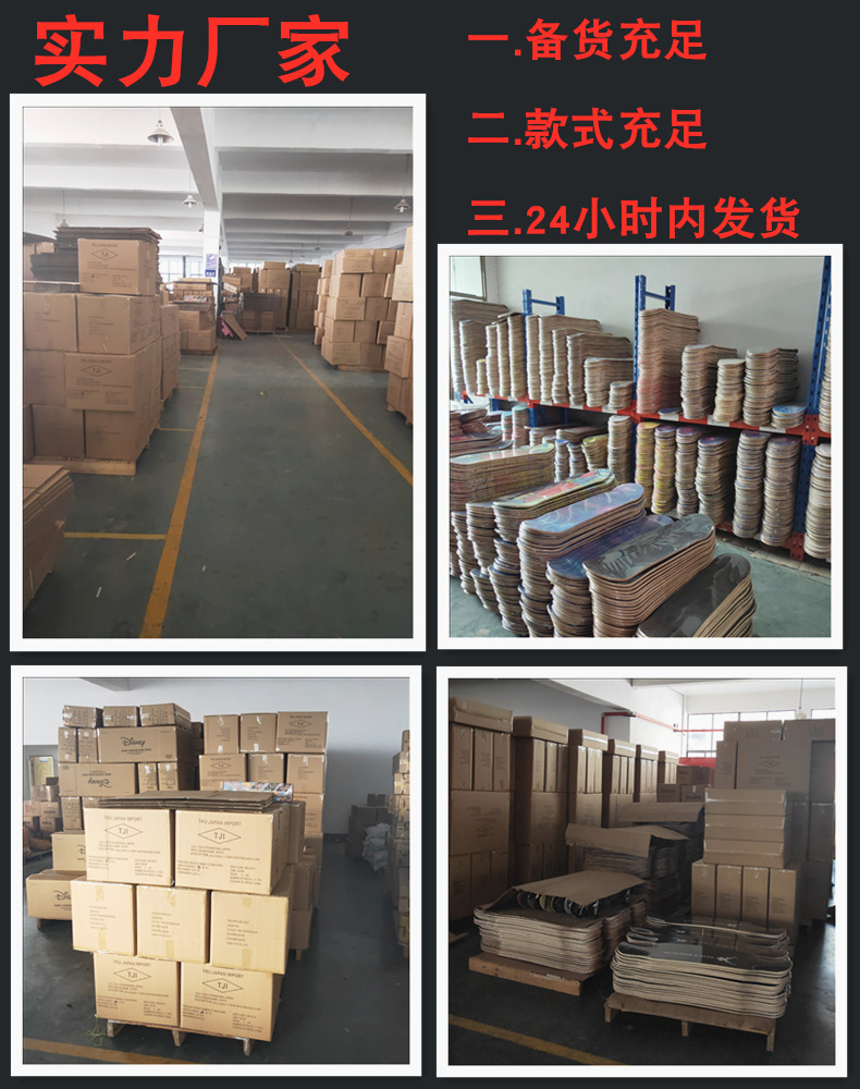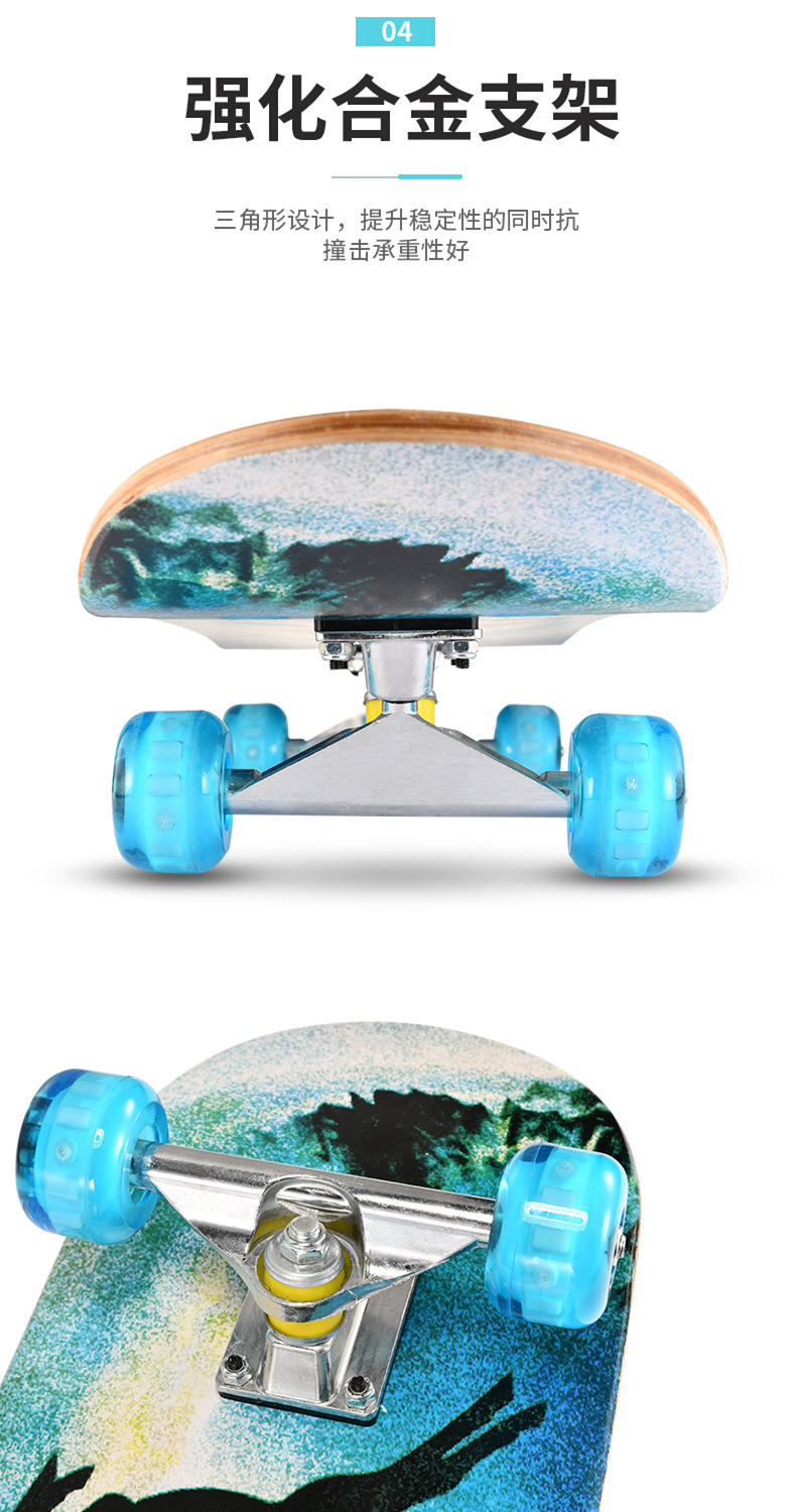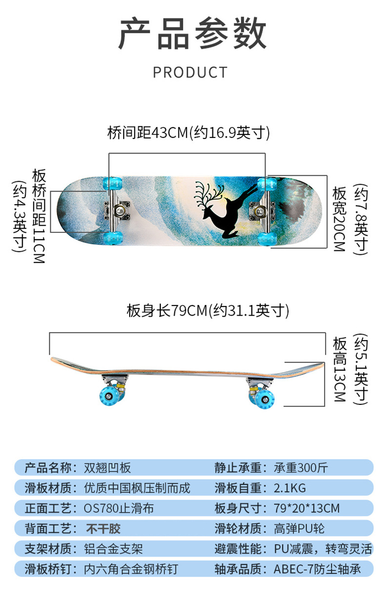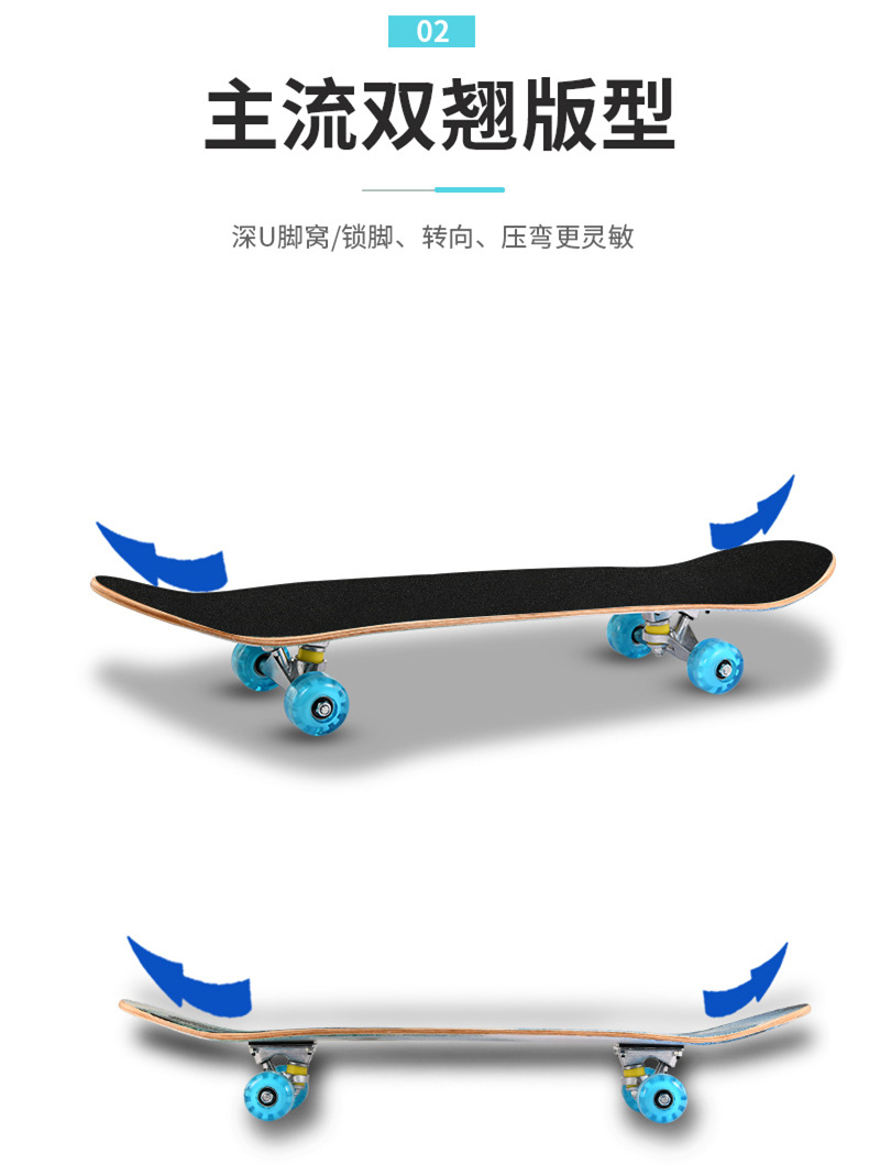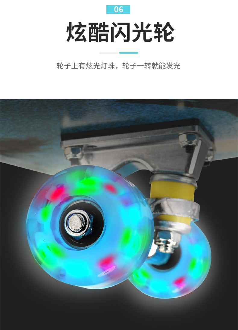 滑板板面:背面图案采用不干胶工艺,正面为PVC防滑黑砂(具有很好的防滑效果)