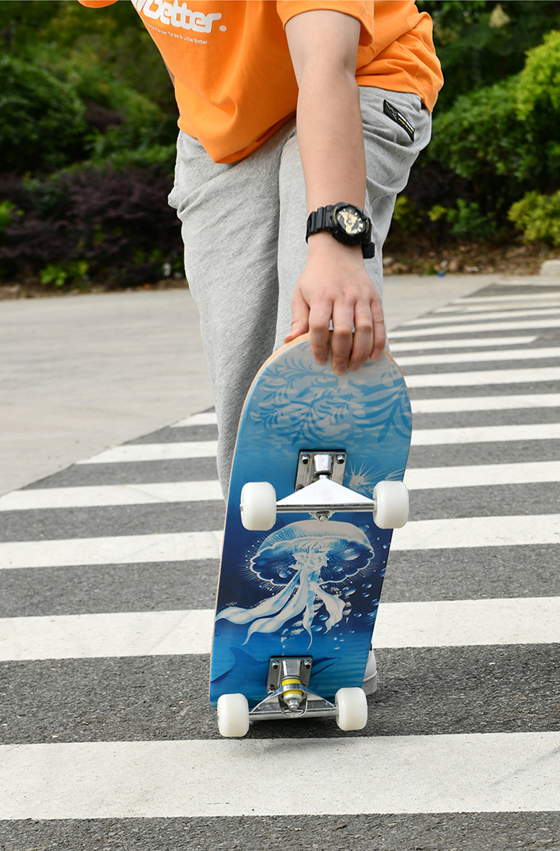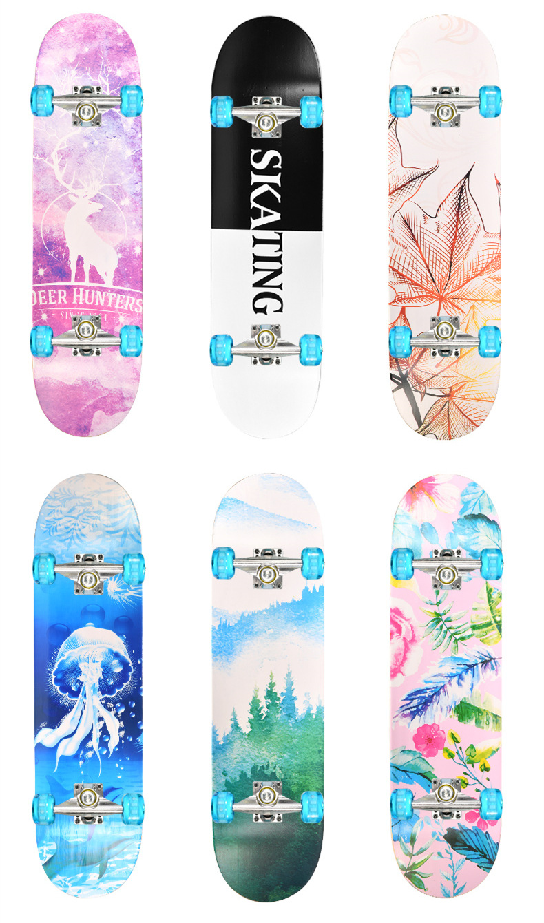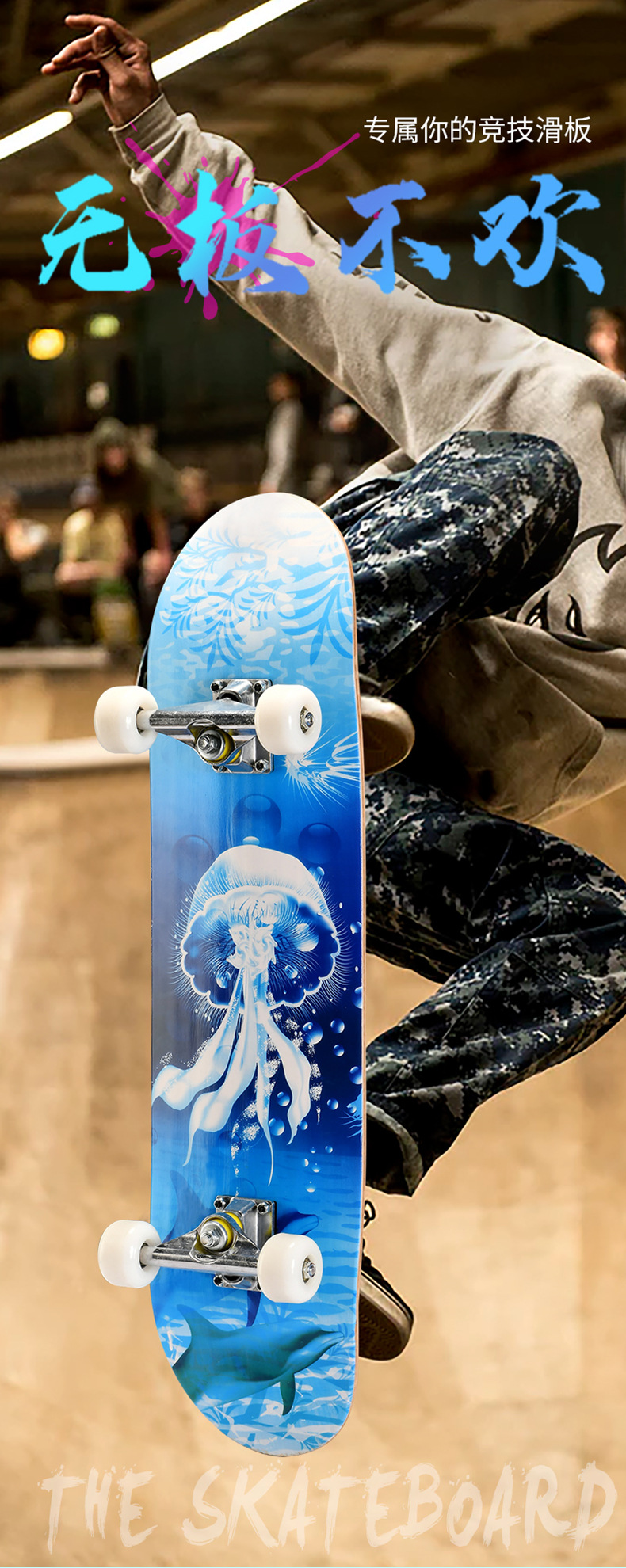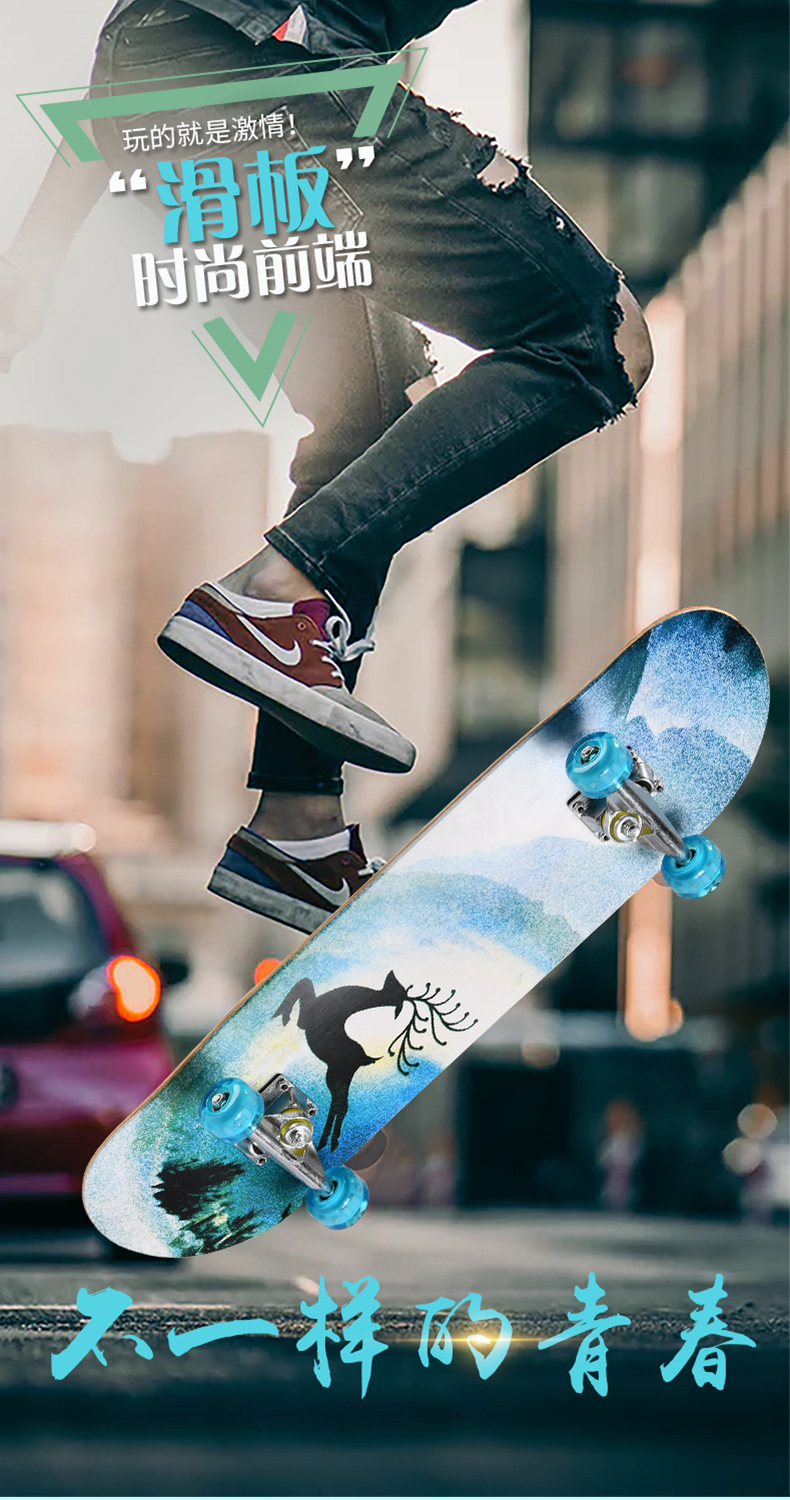 滑板板面:背面图案采用不干胶工艺,正面为PVC防滑黑砂(具有很好的防滑效果)