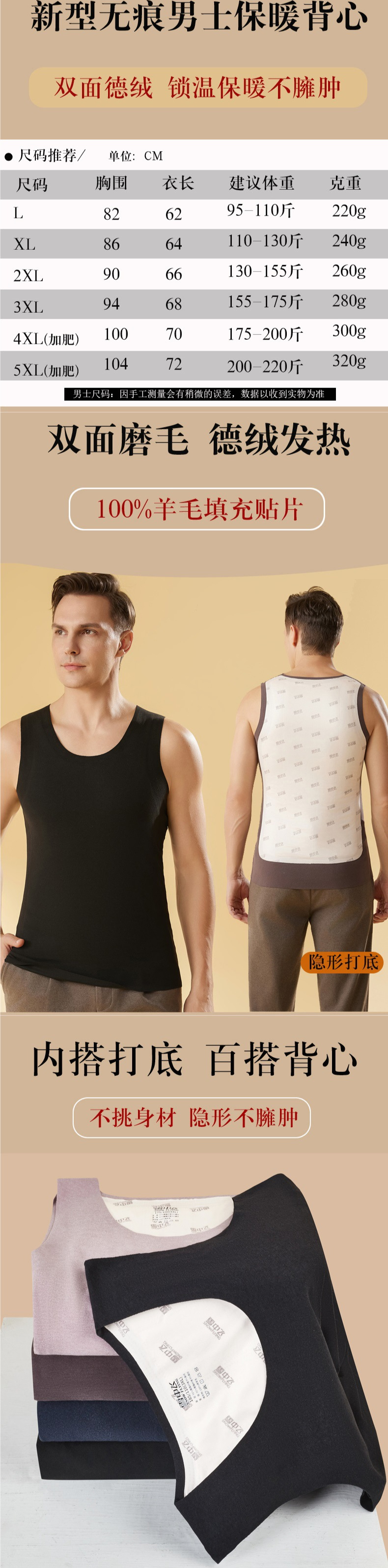 雪中飞保暖背心男士无痕羊毛内搭打底衣马甲高克重401-500g
