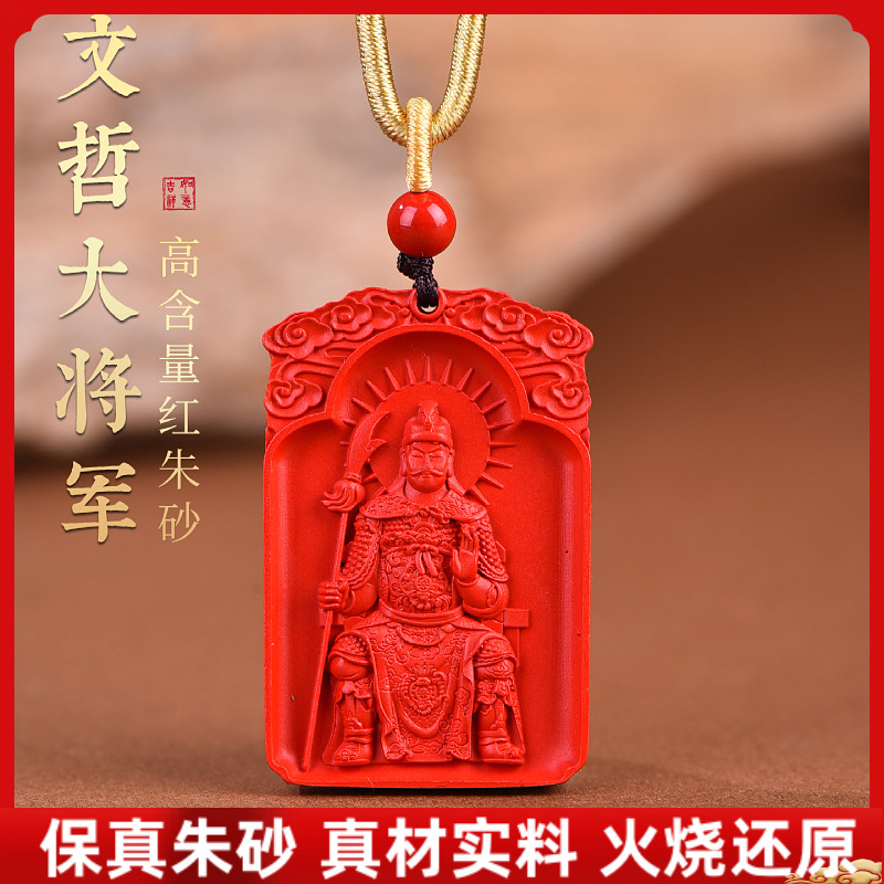 原矿朱砂文哲大将军佛像吊坠高含量帝王红砂本命年护身符吊坠项链