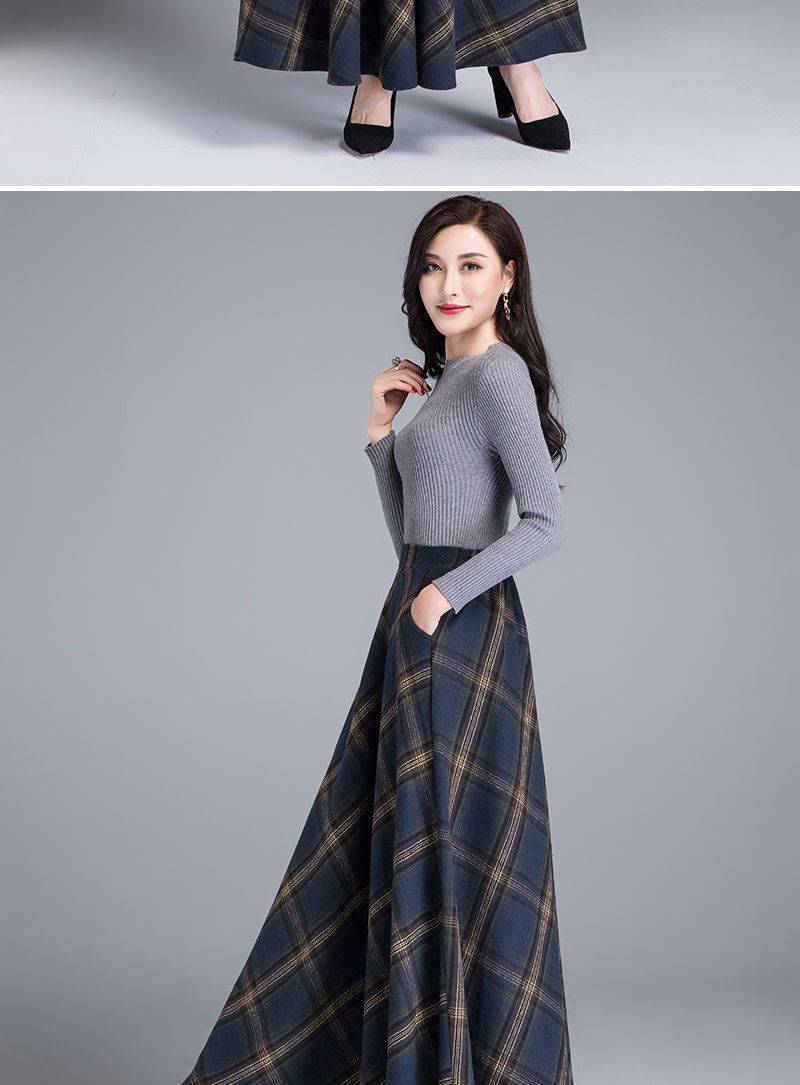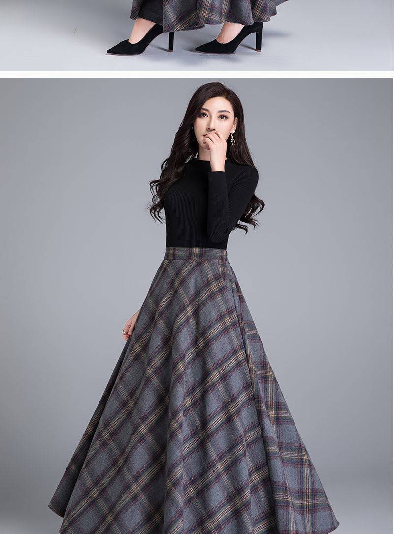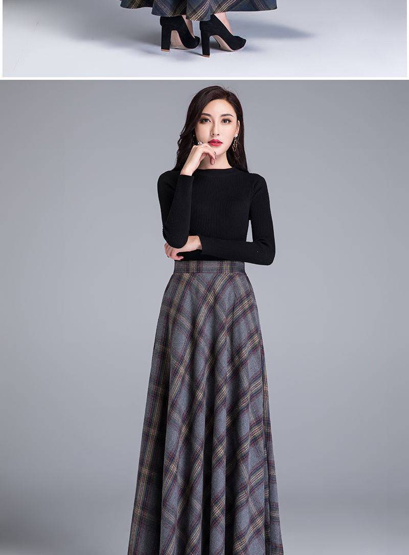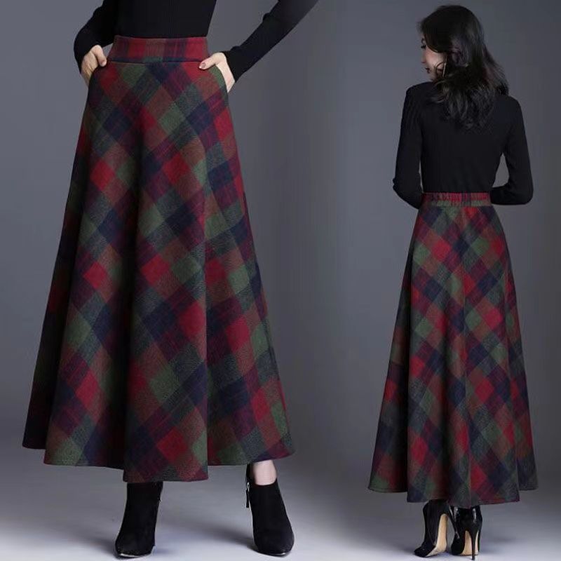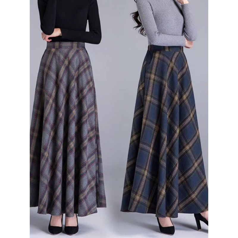 外国貿易向け秋冬新作ウールロングスカート、ハイウエストで万能なチェック柄スカート、Aラインロングスカート、トレンドのロングスカート