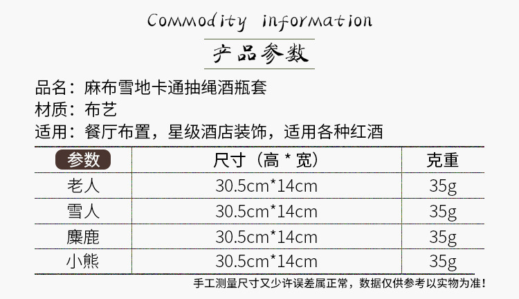 颜色 B2-11栅栏酒瓶套老人款,B2-12栅栏酒瓶套雪人款,B2-13栅栏酒瓶套麋鹿款,B2-14栅栏酒瓶套小熊款