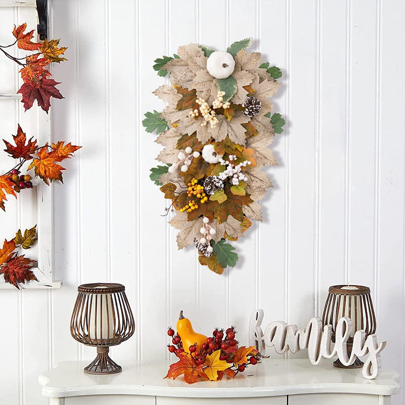 秋の白いカエデの葉白いカボチャ逆さ松ぼっくりベリー壁掛け装飾不織布ベースの壁ドアフロント装飾吊り下げ装飾