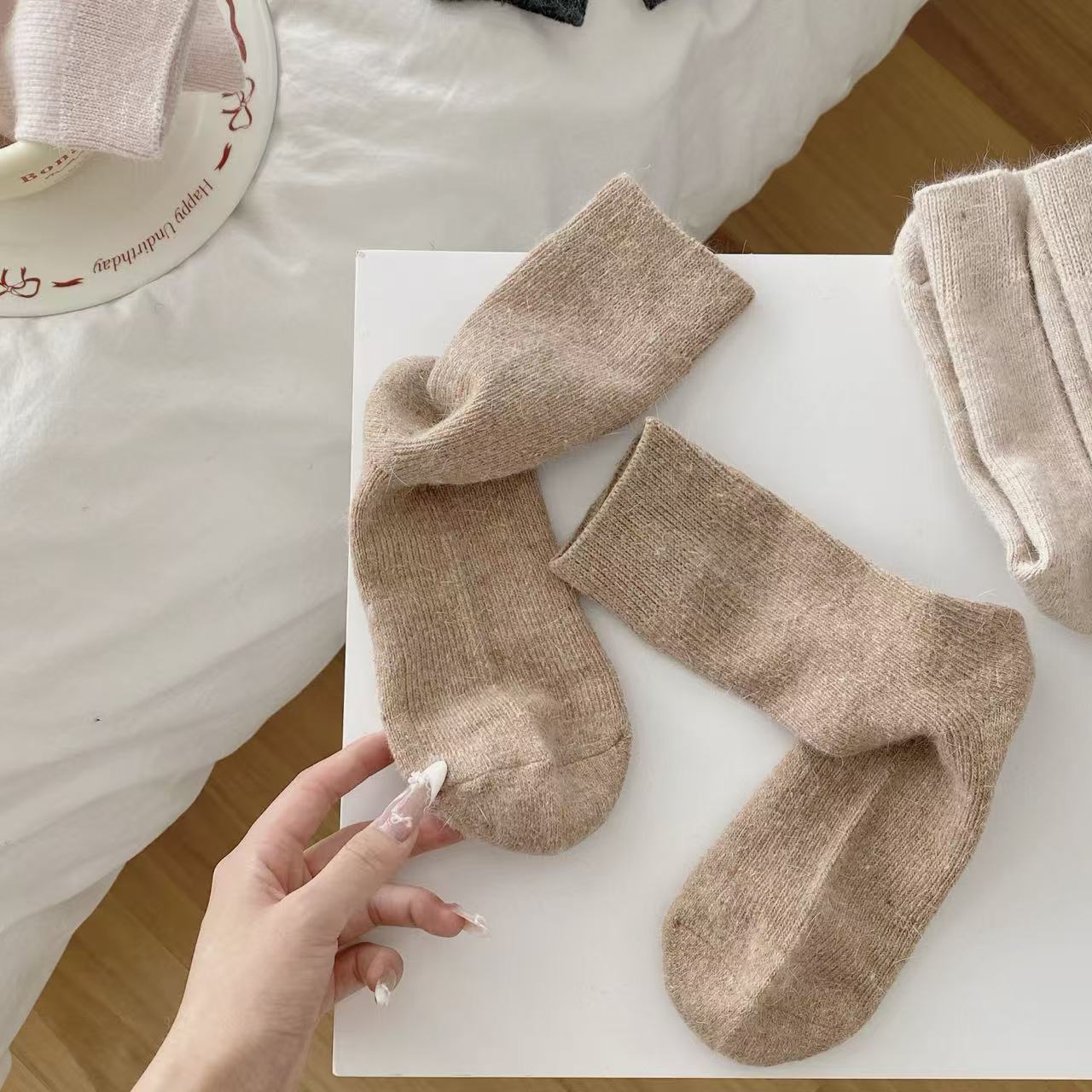 袜子女秋冬季纯色中筒羊毛袜加厚保暖居家冬天羊毛袜女士长袜批发