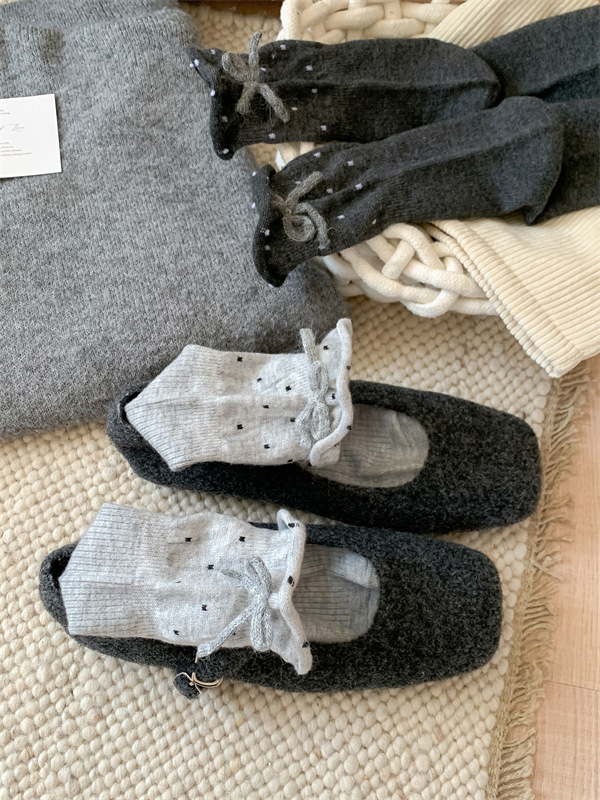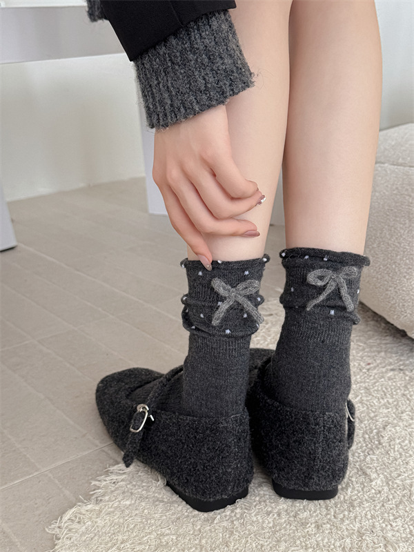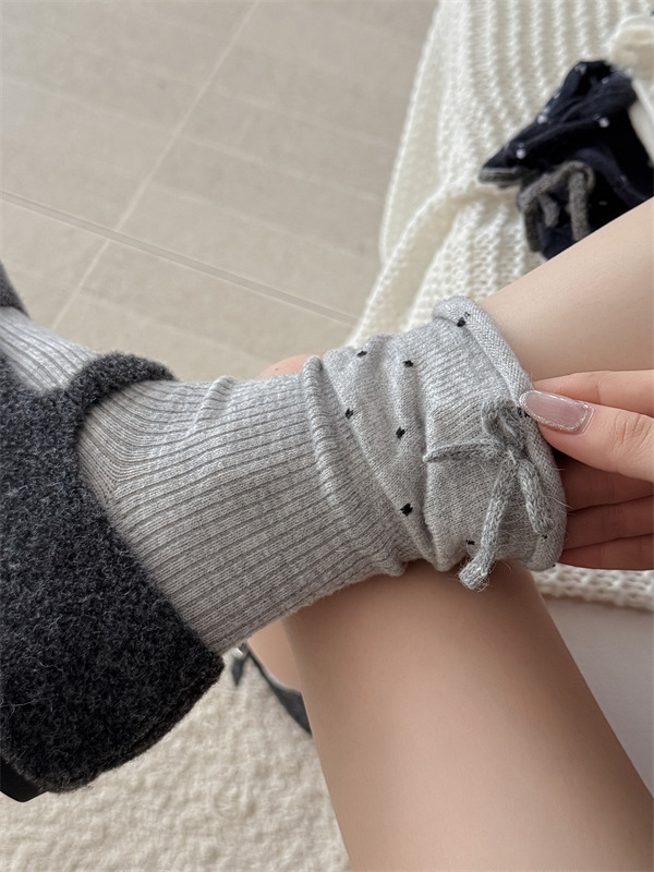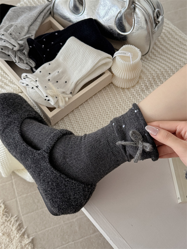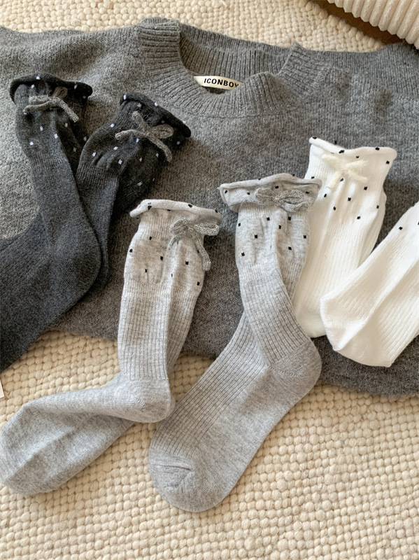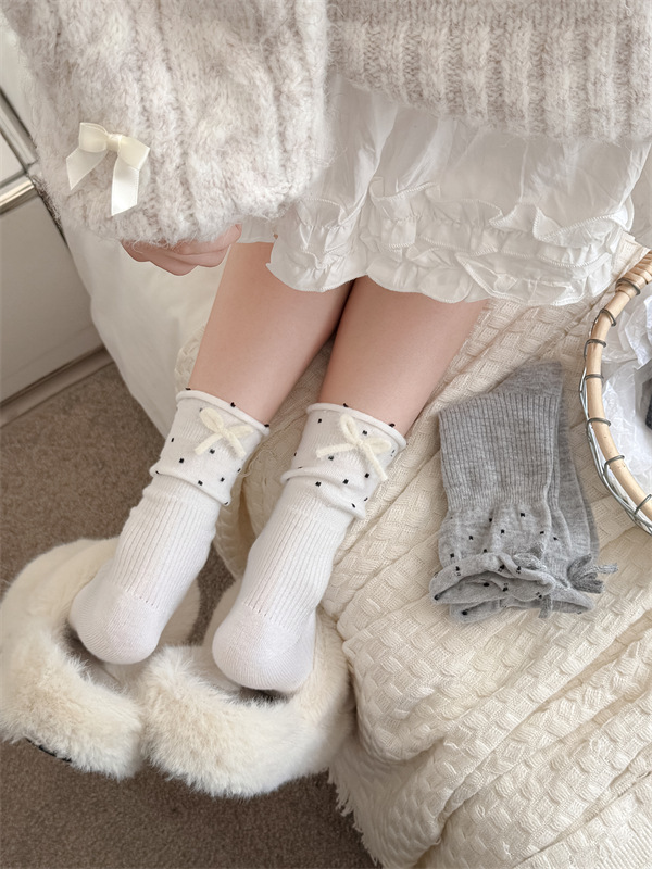 日系立体蝴蝶结袜子白色波点堆堆袜芭蕾风甜美可爱花边学生中筒袜