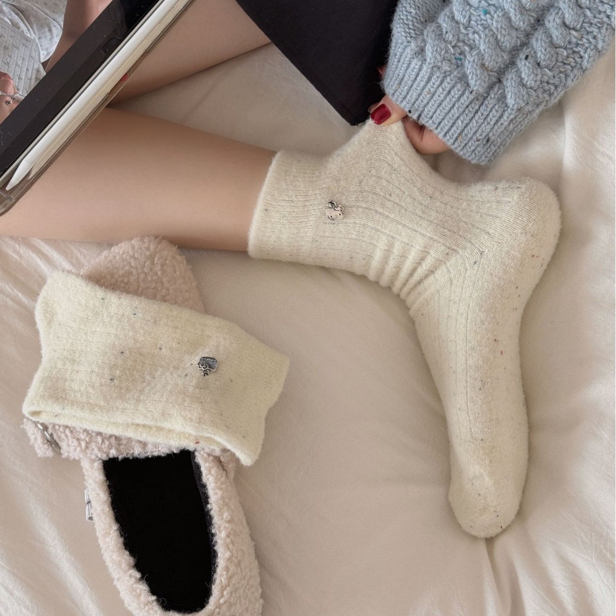 澳绒袜子女秋冬季中筒袜卡通加绒加厚保暖地板袜日系可爱百搭女