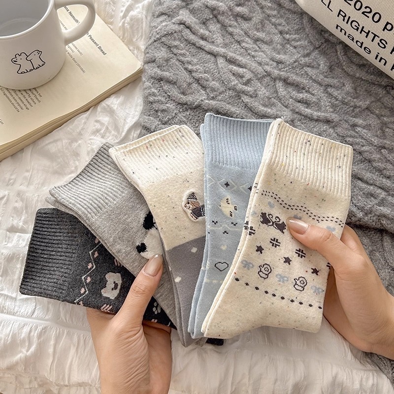 新款可爱卡通袜子女中筒袜棉袜ins潮日系白色灰色小狗薄款长袜