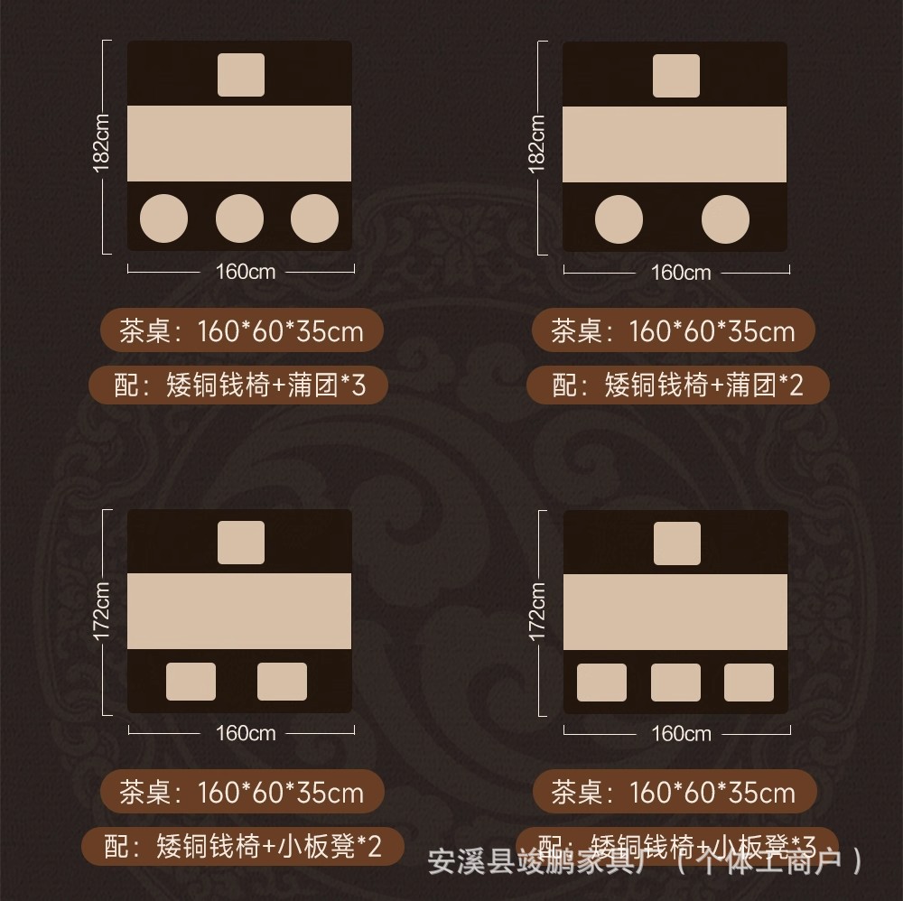 颜色 1.2米大叶松茶桌+矮铜钱椅+蒲团*2,1.4米大叶松茶桌+矮铜钱椅+蒲团*2,1.6米大叶松茶桌+矮铜钱椅+蒲团*3,1.8米大叶松茶桌+矮铜钱椅+蒲团*3,1.2米大叶松茶桌+矮铜钱椅+小板凳*2,1.4米大叶松茶桌+矮铜钱椅+小板凳*2,1.6米大叶松茶桌+矮铜钱椅+小板凳*3,1.8米大叶松茶桌+矮铜钱椅+小板凳*3,1.2米大叶松茶桌+矮铜钱椅*3,1.4米大叶松茶桌+矮铜钱椅*3,1.6米大叶松茶桌+矮铜钱椅*3,1.8米大叶松茶桌+矮铜钱椅*3,大叶松茶桌:120*60*35*5cm,大叶松茶桌:140*60*35*5cm,大叶松茶桌:160*60*35*5cm,大叶松茶桌:180*60*35*5cm,白蜡木茶桌:120*60*33*3cm,白蜡木茶桌:140*60*33*3cm,白蜡木茶桌:160*60*33*3cm,白蜡木茶桌:180*60*33*3cm,矮铜钱椅