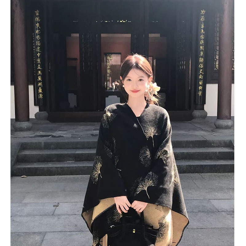 银杏叶披肩秋冬季保暖围巾暗黑开叉斗篷旅游民族风外搭加厚披风女