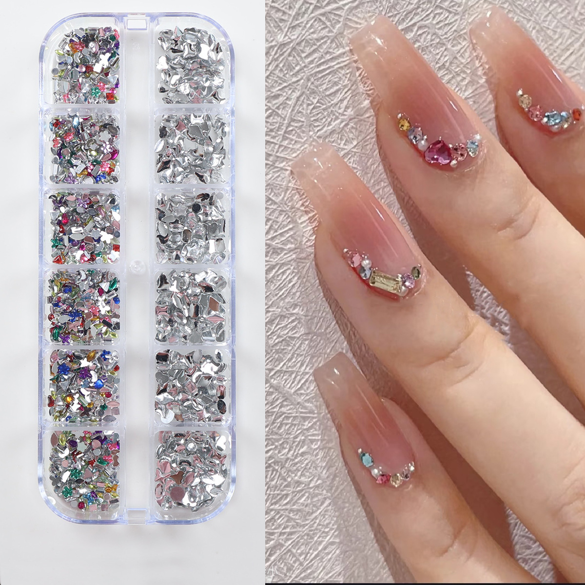12 グリッド箱入りミニネイルアートダイヤモンド混合フラッシュカラフルな平底特殊形状ダイヤモンドスターマウスアイラブネイルアートアクセサリー