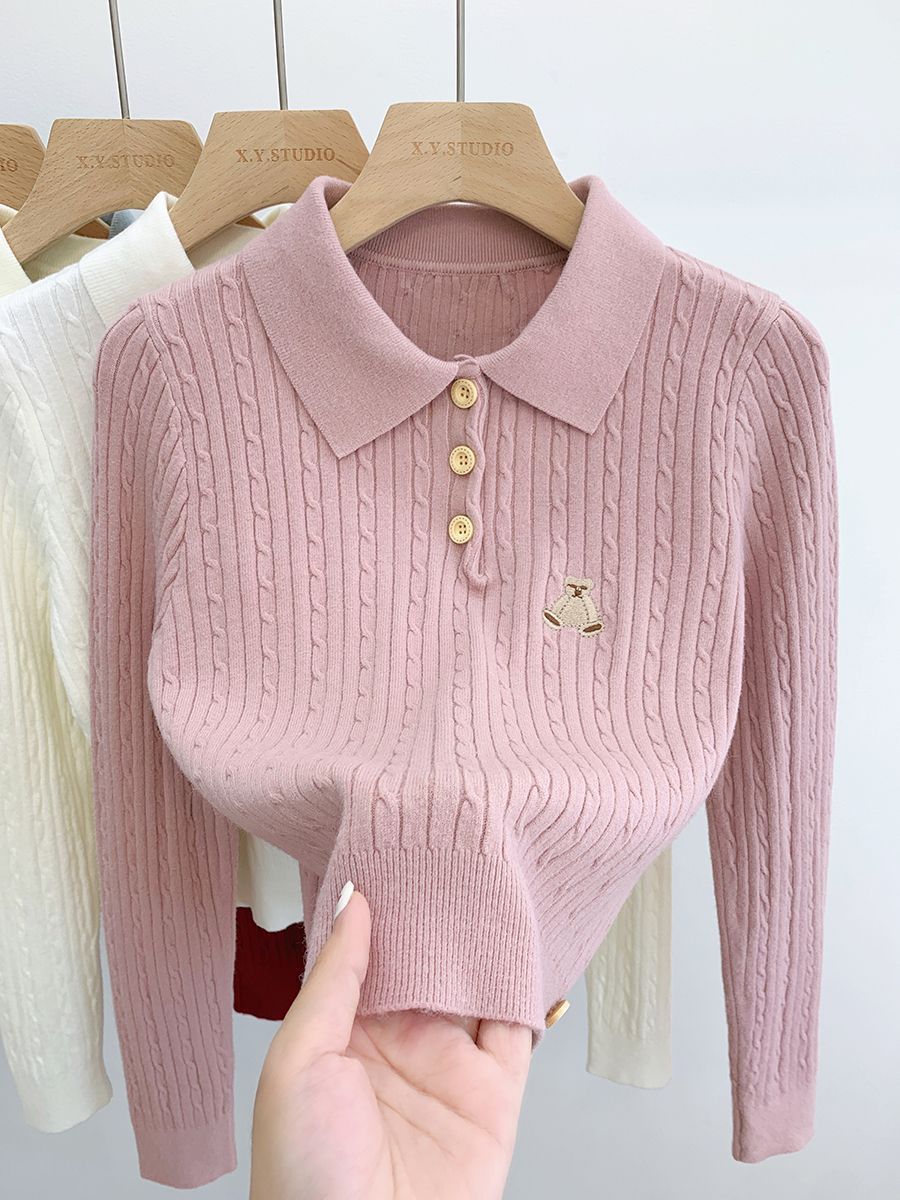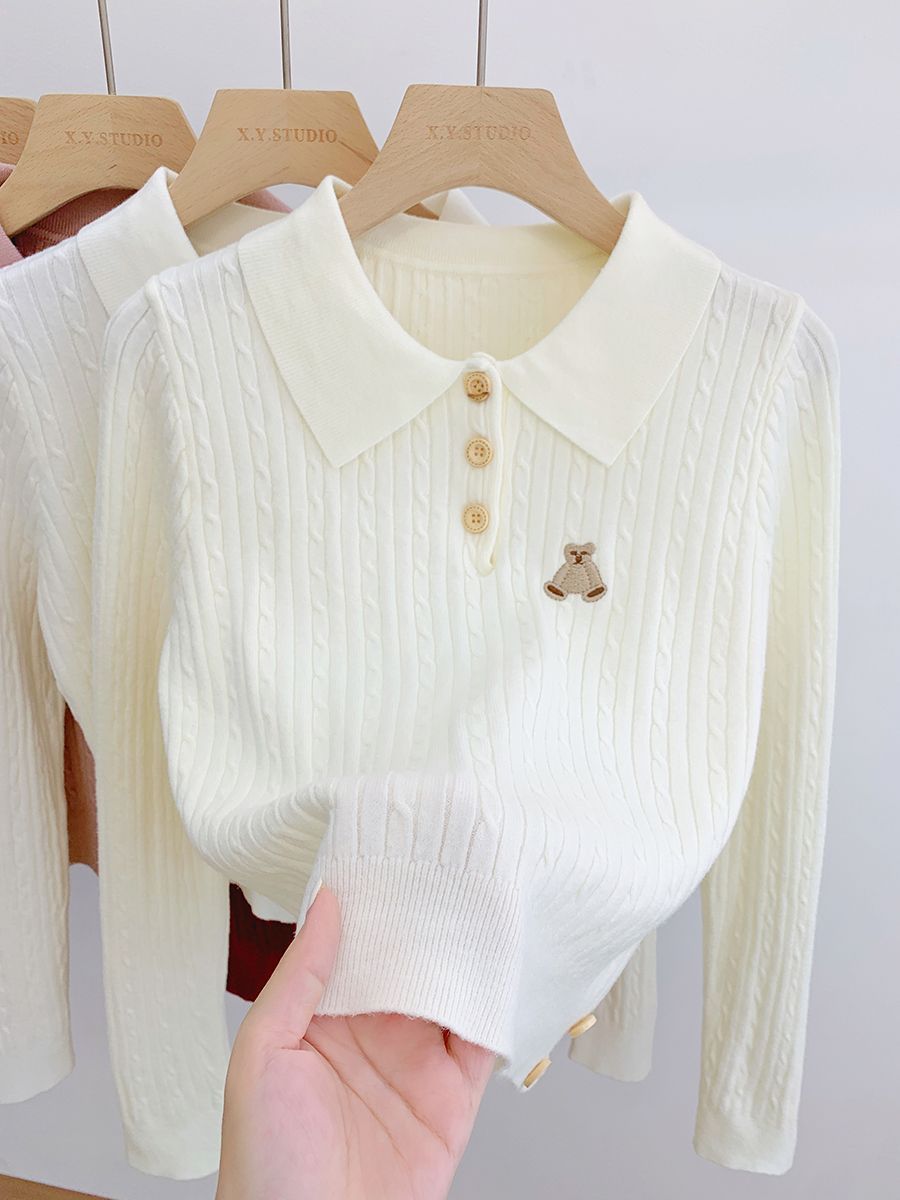 翻领小熊设计感毛衣针织衫秋冬新款温柔风白搭韩系打底衫上衣女