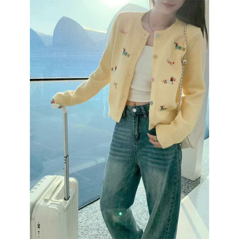 黄色の怠惰な風の短い丸首はセーターのカーディガンの2025春にやせているニットのコートを結びます。