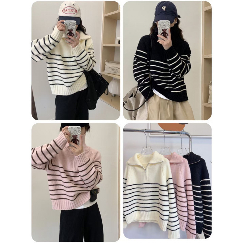 韩国东大门半拉链翻领毛衣女韩系小众条纹宽松上衣套头针织衫潮