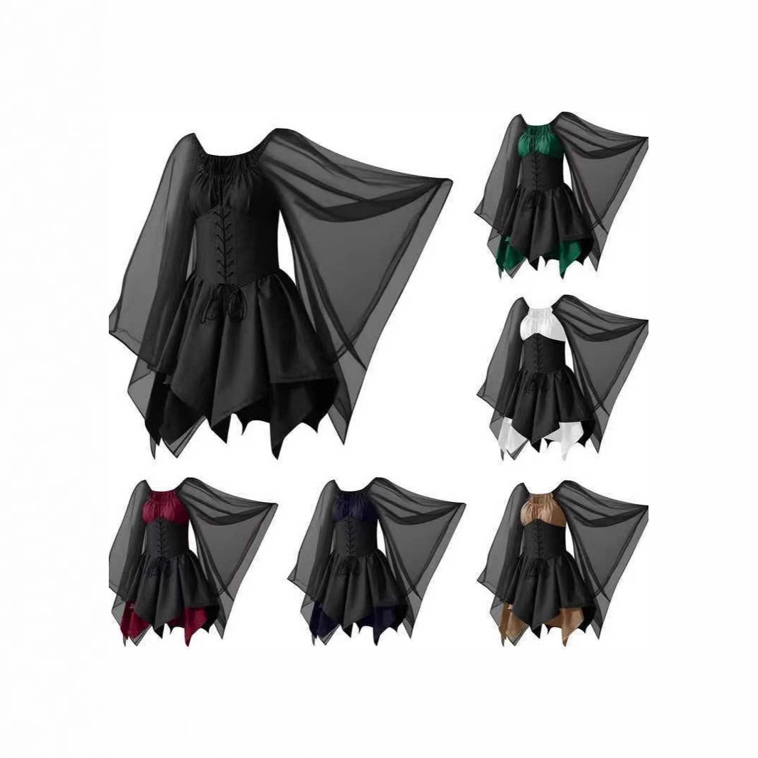 跨境新款欧美喇叭袖长袖中世纪文艺复兴连衣裙拼接长裙