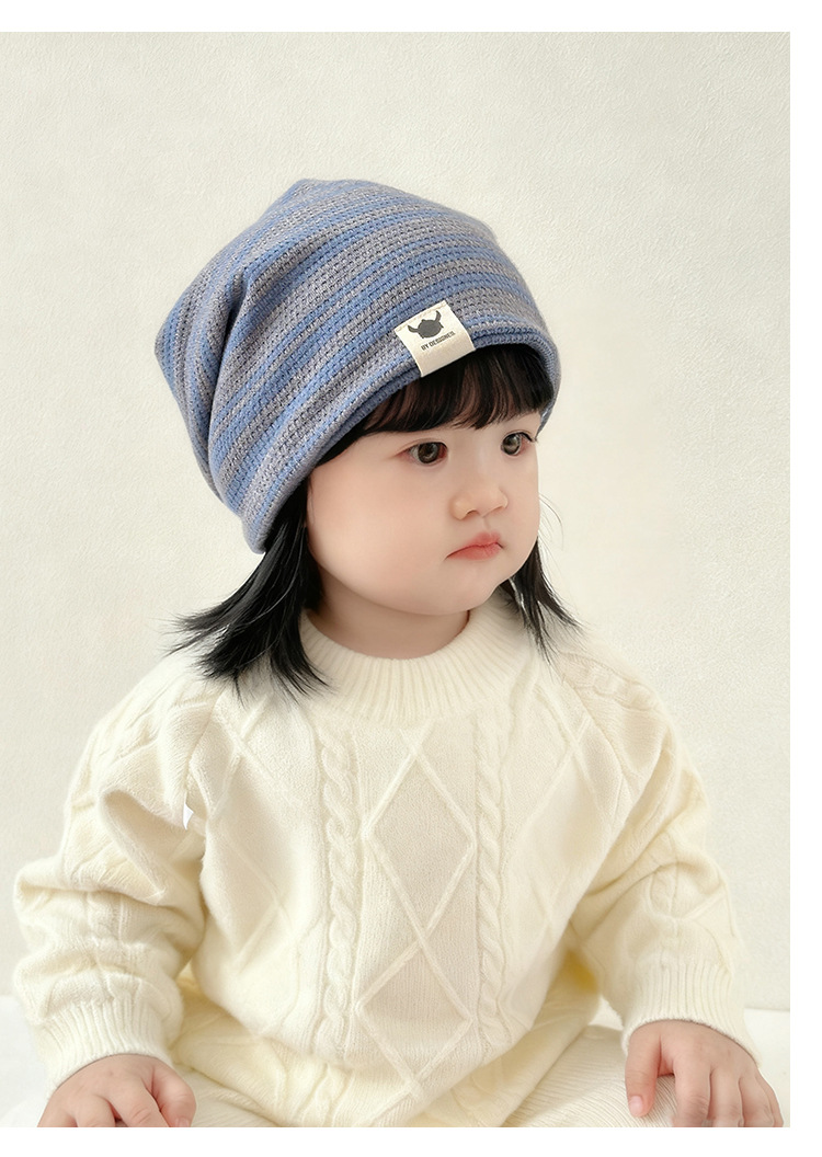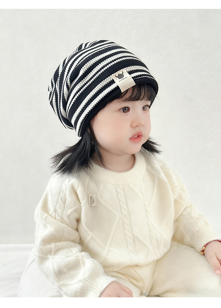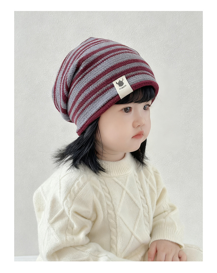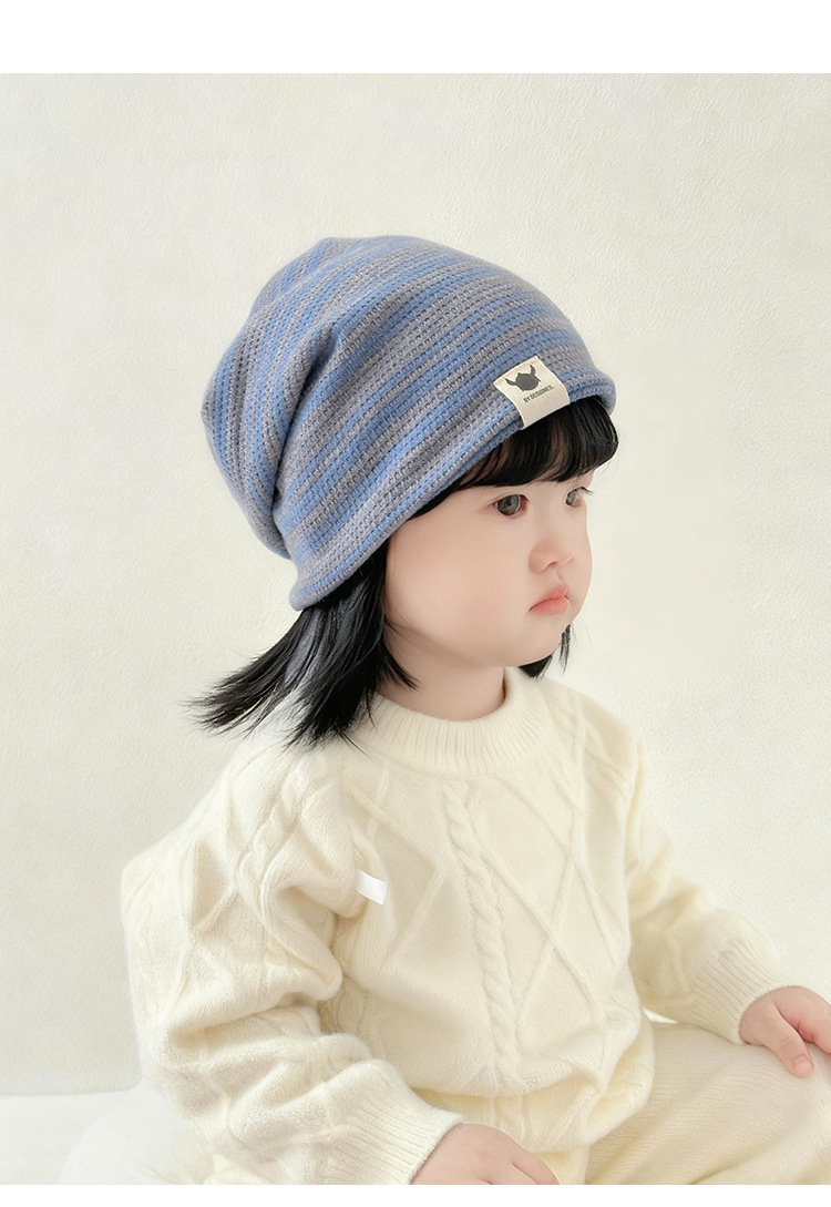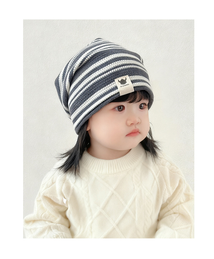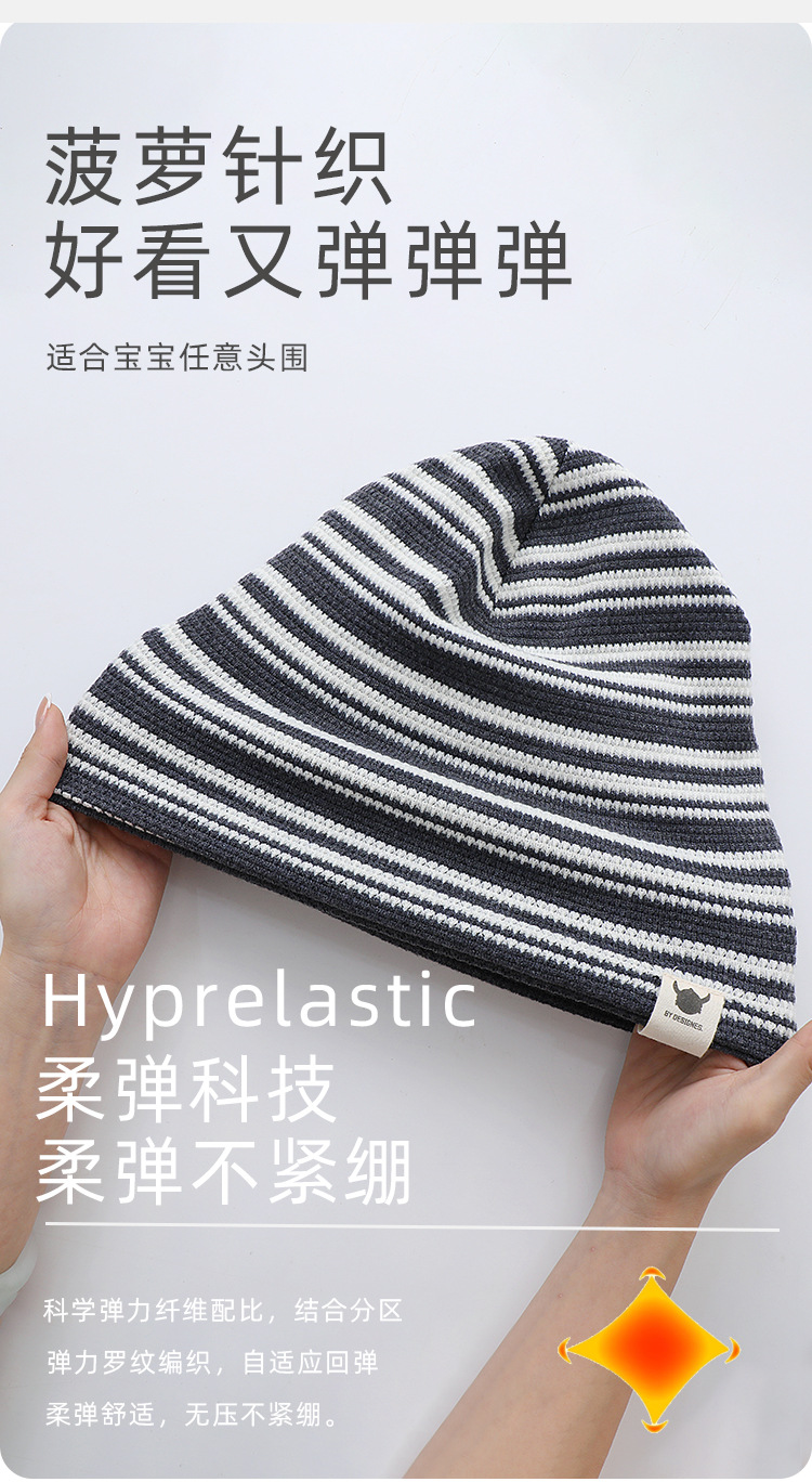 韩版新款硅胶标翻边儿童帽子秋冬季防风保暖套头帽条纹宝宝护耳帽