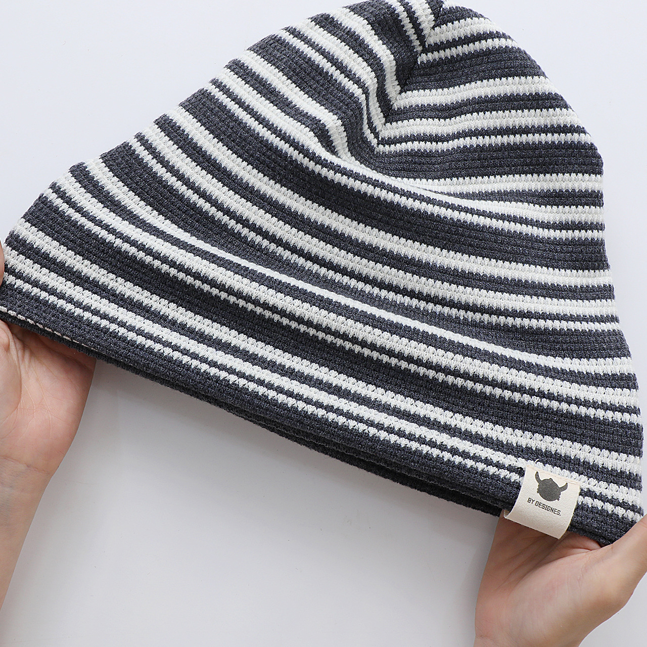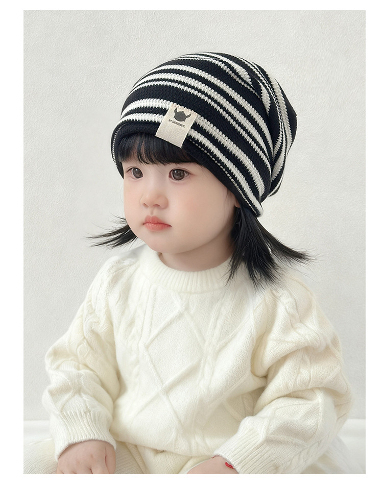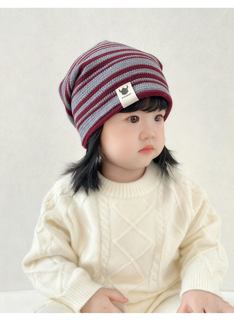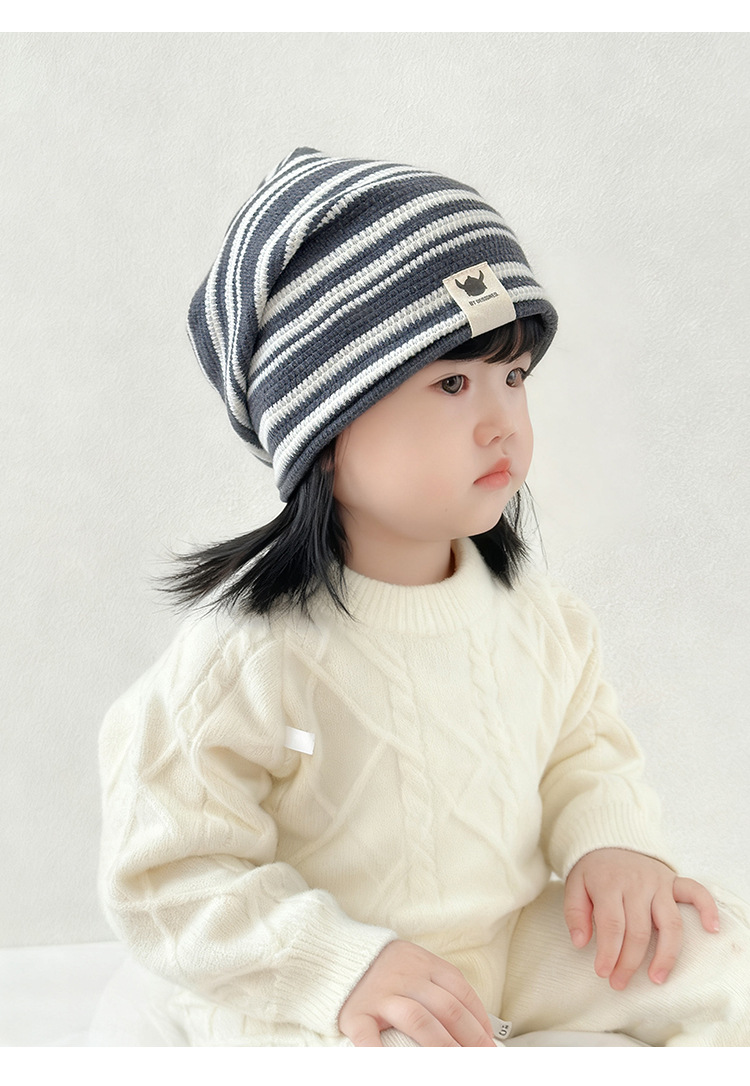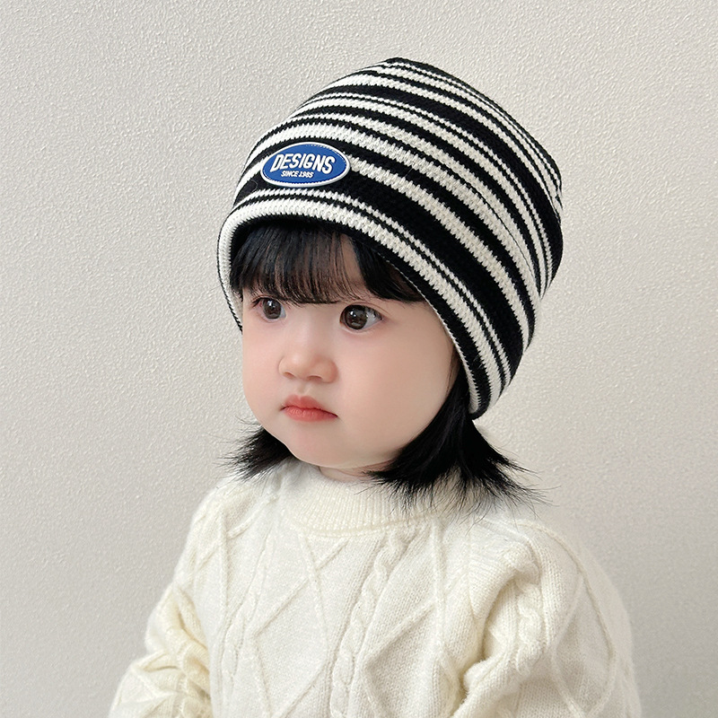 韩版新款硅胶标翻边儿童帽子秋冬季防风保暖套头帽条纹宝宝护耳帽