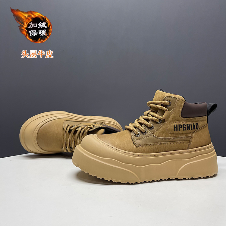 冬季新款中帮板鞋男厚底增高鞋男士运动休闲鞋马丁靴男款头层牛皮