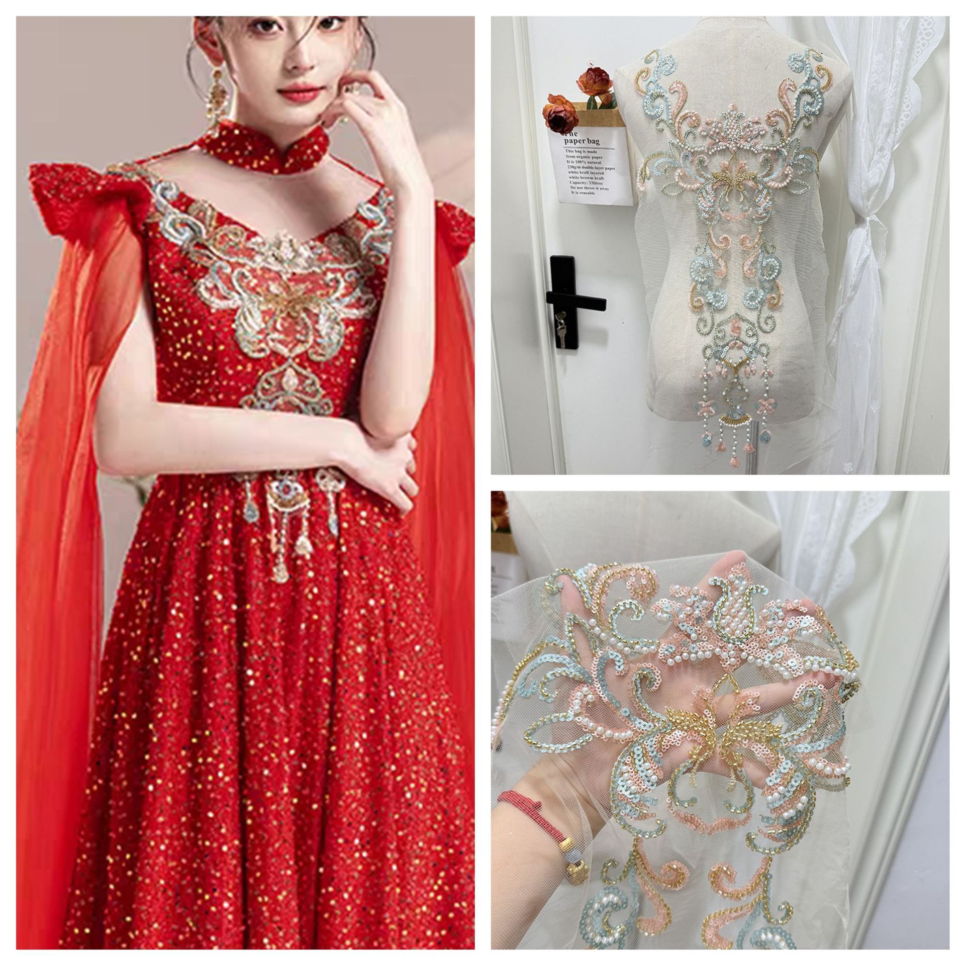 红色旗袍网底五彩亮片珠绣对花辅料婚纱晚礼服秀禾服辅料配饰花贴